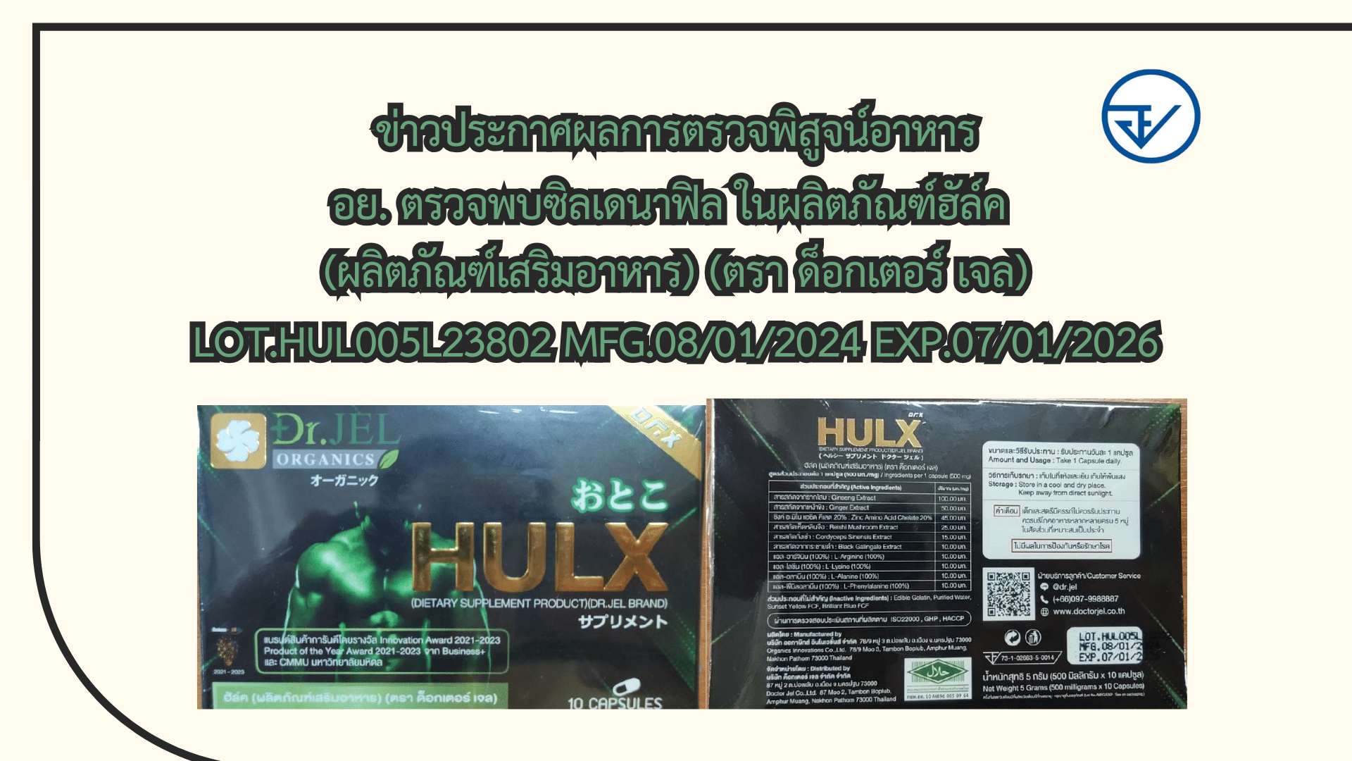วันที่ 4 กรกฎาคม 2567 สำนักงานคณะกรรมการอาหารและยา (อย.) รายงานผลการส่งตรวจพิสูจน์อาหาร ของผลิตภัณฑ์เสริมอาหาร “ฮัล์ค” ตรา ด็อกเตอร์ เจล HULX (DIETARY SUPPLEMENT PRODUCT (DR.JEL BRAND) LOT.HUL005L23802 MFG.08/01/2024 EXP.07/01/2026 ระบุว่า ตรวจพบซิลเดนาฟิล หนึ่งในยาควบคุมพิเศษภายใต้การกำกับดูแลของแพทย์ และต้องใช้ใบสั่งแพทย์ในการซื้อเท่านั้น มีสรรพคุณในการรักษาโรคเสื่อมสมรรถภาพทางเพศ ก่อให้เกิดผลข้างเคียง เช่น ปวดหัว หน้าแดง การมองเห็นผิดปกติ ความดันโลหิตต่ำ