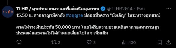 อย่างไรก็ตาม ศูนย์ทนายความเพื่อสิทธิมนุษยชน รายงานว่า ศาลอนุญาตให้ประกันตัว “บังเอิญ” ในระหว่างการยื่นอุทธรณ์ โดยตีราคาประกัน 50,000 บาท ซึ่งได้รับการสนับสนุนจากกองทุนราษฎรประสงค์ โดยศาลไม่ได้กำหนดเงื่อนไขเพิ่มเติมแต่อย่างใด