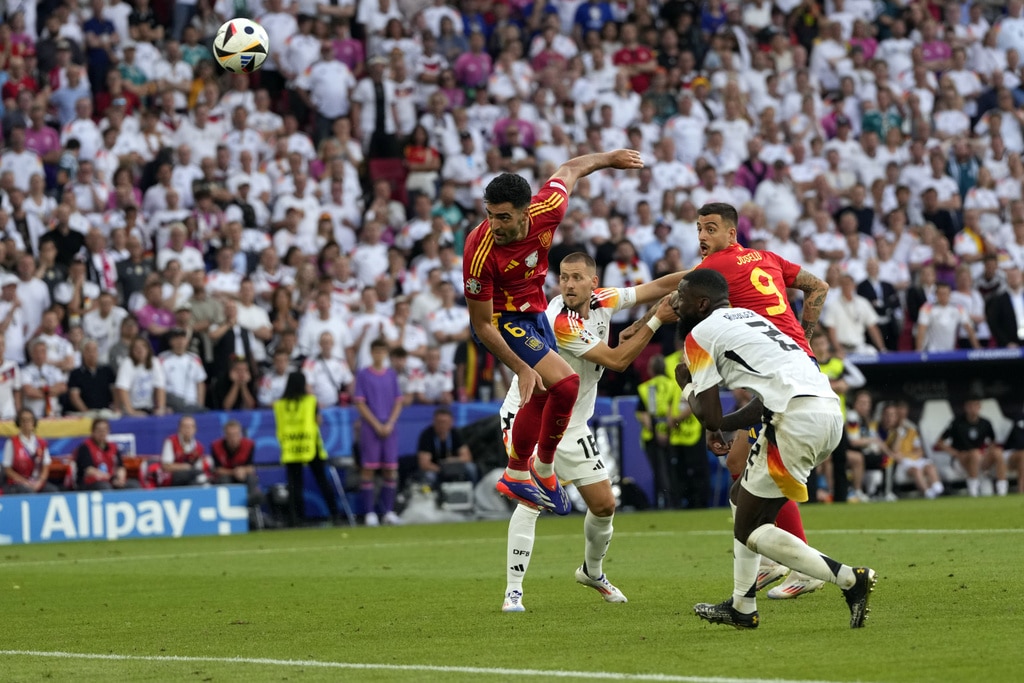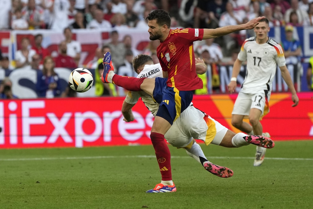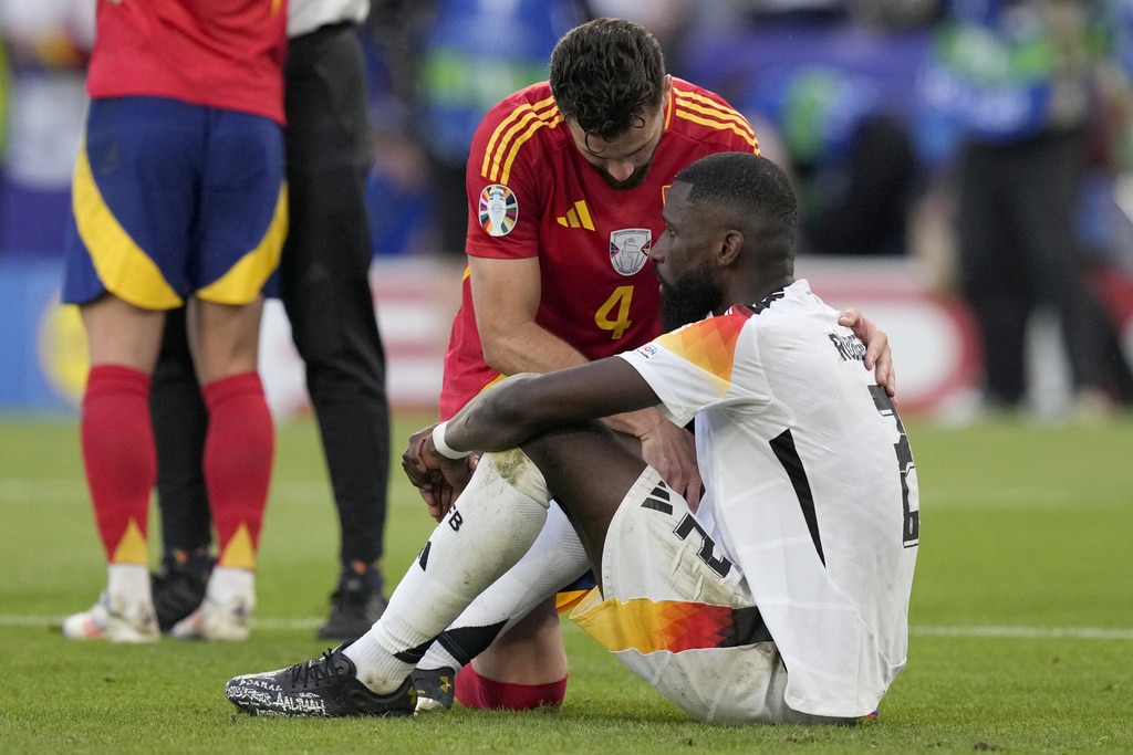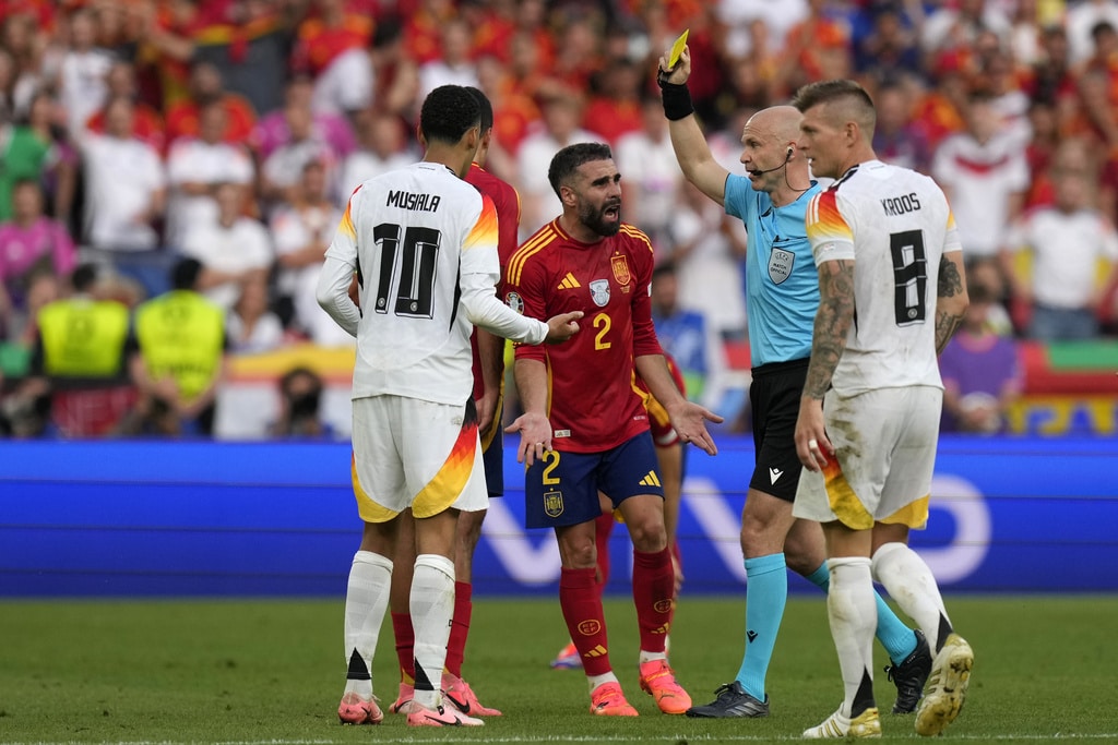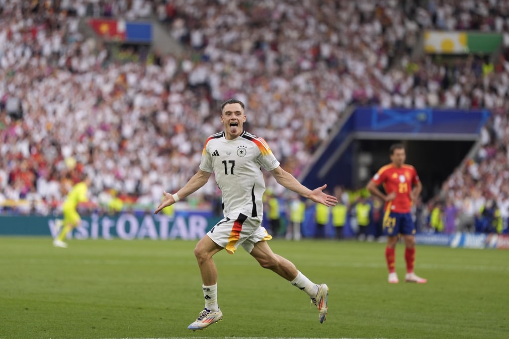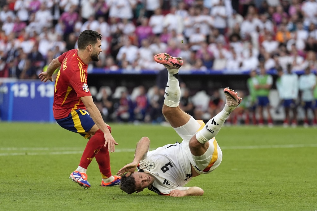 Germany’s Florian Wirtz celebrates after scoring his side’s opening goal during a quarter final match between Germany and Spain at the Euro 2024 soccer tournament in Stuttgart, Germany, Friday, July 5, 2024. (AP Photo/Ariel Schalit)Germany’s Florian Wirtz reacts after a goal attempt during a quarter final match between Germany and Spain at the Euro 2024 soccer tournament in Stuttgart, Germany, Friday, July 5, 2024. (AP Photo/Ariel Schalit)Spain’s Lamine Yamal, front, is challenged by Germany’s Jamal Musiala during a quarter final match between Germany and Spain at the Euro 2024 soccer tournament in Stuttgart, Germany, Friday, July 5, 2024. (AP Photo/Ariel Schalit)Germany’s Niclas Fuellkrug, right, falls on the ground after a tussle for the ball with Spain’s Nacho during a quarter final match between Germany and Spain at the Euro 2024 soccer tournament in Stuttgart, Germany, Friday, July 5, 2024. (AP Photo/Ariel Schalit)Spain’s players celebrate at the end of a quarter final match between Germany and Spain at the Euro 2024 soccer tournament in Stuttgart, Germany, Friday, July 5, 2024. (AP Photo/Ariel Schalit)Spain’s Nacho, left, with Germany’s Jonathan Tah at the end of a quarter final match between Germany and Spain at the Euro 2024 soccer tournament in Stuttgart, Germany, Friday, July 5, 2024. (AP Photo/Ariel Schalit)Spain’s Dani Carvajal, left, and Germany’s Niclas Fuellkrug vie for the ball during a quarter final match between Germany and Spain at the Euro 2024 soccer tournament in Stuttgart, Germany, Friday, July 5, 2024. (AP Photo/Matthias Schrader)Germany’s Toni Kroos walks off the pitch after a quarter final match between Germany and Spain at the Euro 2024 soccer tournament in Stuttgart, Germany, Friday, July 5, 2024. (AP Photo/Manu Fernandez)Spain’s Mikel Merino (6) scores his side’s second goal during a quarter final match between Germany and Spain at the Euro 2024 soccer tournament in Stuttgart, Germany, Friday, July 5, 2024. (AP Photo/Antonio Calanni)Spain’s Dani Carvajal, centre, reacts as referee Anthony Taylor of England, shows him a yellow card during a quarter final match between Germany and Spain at the Euro 2024 soccer tournament in Stuttgart, Germany, Friday, July 5, 2024. (AP Photo/Ariel Schalit)