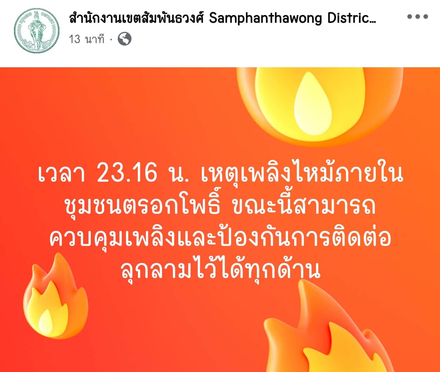 23.37 เพลิงสงบทุกจุด ศูนย์วิทยุพระรามแจ้ง เหตุเพลิงไหม้ภายในชุมชนตรอกโพธิ์ เขตสัมพันธวงศ์ เพลิงสงบ รายละเอียดเพิ่มเติมอยู่ระหว่างการตรวจสอบ