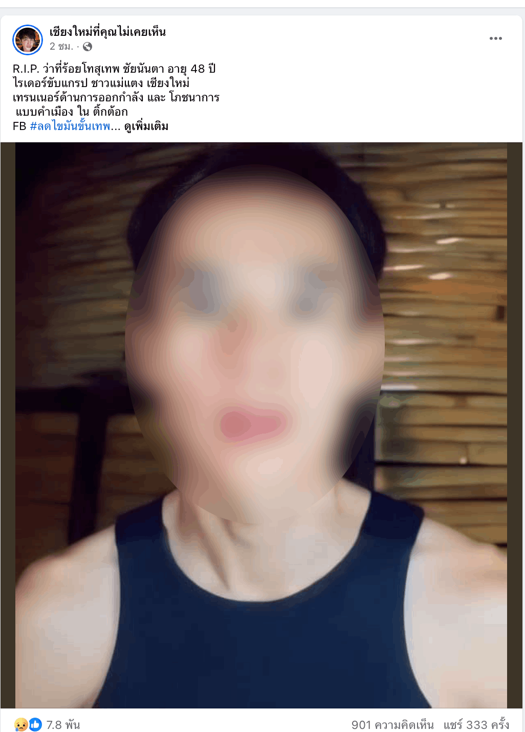 แฟนเพจเฟซบุ๊ก เชียงใหม่ที่คุณไม่เคยเห็น ได้โพสต์ภาพของว่าที่ร้อยโทสุเทพ พร้อมข้อความแสดงความอาลัย ระบุว่า “R.I.P. ว่าที่ร้อยโทสุเทพ (ขอสงวนนามสกุล) อายุ 48 ปี ไรเดอร์ขับแกร็บ ชาวแม่แตง เชียงใหม่ เทรนเนอร์ด้านการออกกำลังและโภชนาการ แบบคำเมือง ใน ติ๊กต็อก FB #ลดไขมันขั้นเทพ