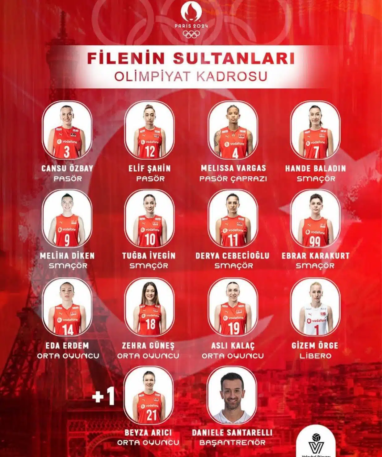 ได้มีการเปิดเผย 12 รายชื่อ นักวอลเลย์บอลหญิงทีมชาติตุรกี เข้าร่วมการแข่งขัน โอลิมปิก ปารีส 2024 ที่เซาท์ ปารีส อารีน่า ที่กรุงปารีส ระหว่างวันที่ วันที่ 27 กรกฏาคม – 11 สิงหาคม 2567 นี้ ออกมาให้แฟน ๆ ได้ทราบกันแล้ว