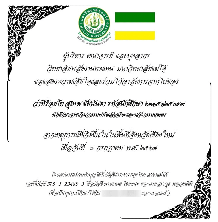 มหาวิทยาลัยแม่โจ้ เปิดรับบริจาค ช่วยเหลือครอบครัว ว่าที่ร้อยโทสุเทพ ชัยนันตา เพื่อเป็นทุนการศึกษาให้ลูกชายต่อไป พร้อมสวดพระอภิธรรม 4 คืน