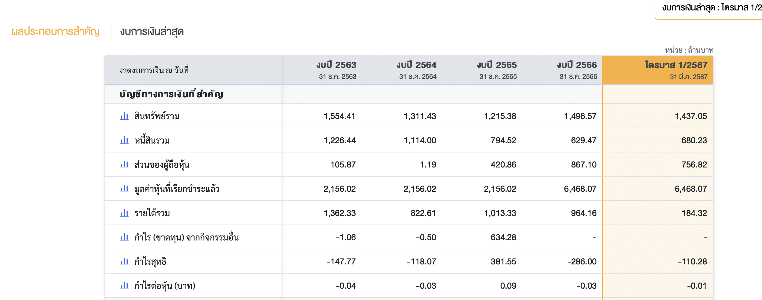ไตรมาส 1/2567 : ขาดทุน 110.28 ล้านบาท จากรายได้รวม 184.32 ล้านบาท