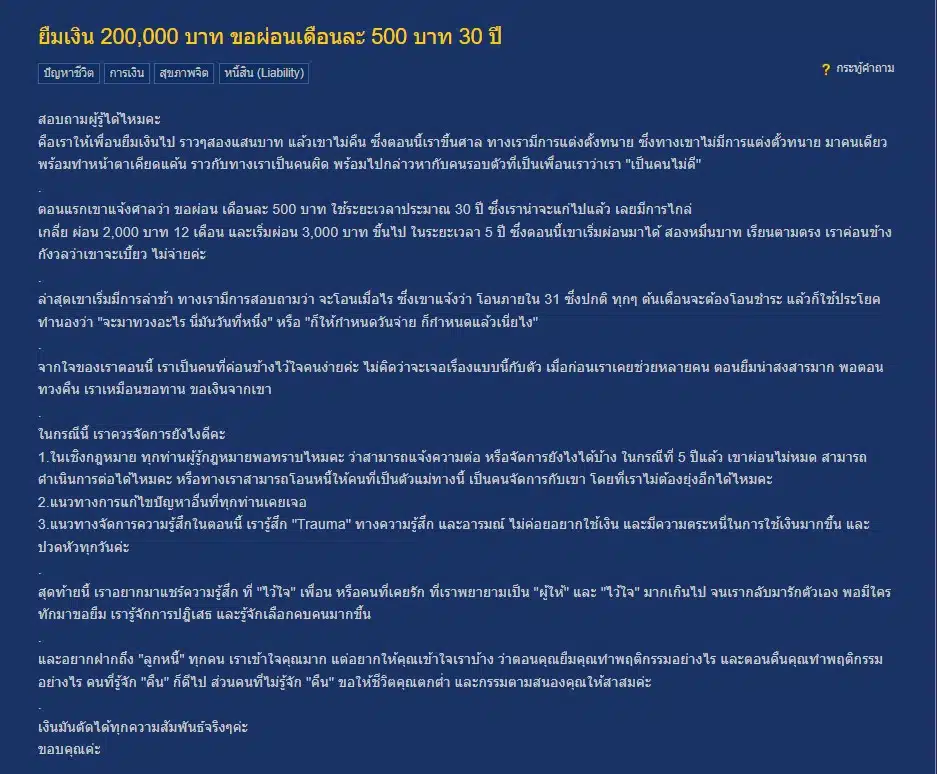 กลายเป็นประเด็นที่พูดถึงบนโลกโซเชียลมีเดียอย่างมาก หลังมีผู้ใช้พันทิป สมาชิกหมายเลข 8282734 ได้ออกมาตั้งคำถามไว้ว่า “ยืมเงิน 200,000 บาท ขอผ่อนเดือนละ 500 บาท 30 ปี”