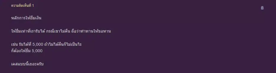 “เราเคยให้ยืมไปแปดหลัก ไม่ได้คืน บุญคุณก็ไม่ได้ 55555 มะก่อนนี่ให้ยืมทุกคนยกเว้นเสาไฟ ตอนนี้บ่ให้ใครยืมทั้งนั้น อยากทำบุญเข้าแอพบริจาคโรงบาลเอา”