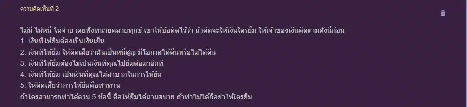 “ไม่มี ไม่หนี้ ไม่จ่าย เคยฟังทนายคลายทุกข์ เขาให้ข้อคิดไว้ว่า ถ้าคิดจะให้เงินใครยืม ให้เจ้าของเงินคิดตามดังนี้ก่อน
