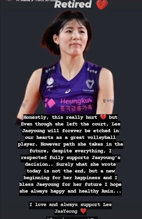 ล่าสุด ทางช่องอินตราแกรม ar_mirae53 ซึ่งเป็นช่องแฟนคลับของ อี แจ-ยอง และ อี ดา-ยอง ได้ออกมาโพสต์ถึงการรีไทร์ของนักตบสาวรายนี้ ไว้ว่า