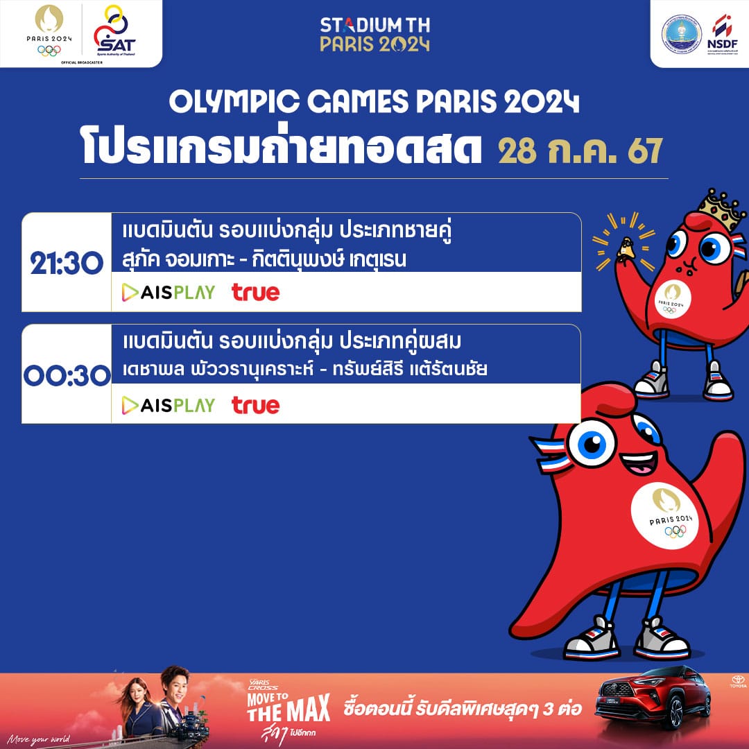 โปรแกรมแข่ง แบดมินตัน โอลิมปิกเกมส์ 2024 ที่กรุงปารีส ประเทศฝรั่งเศส ประจำวันที่ 28 กรกฎาคม 2567 วันนี้มีทัพนักกีฬาไทยลงแข่งขัน เช็คโปรแกรมพร้อมช่องทางถ่ายทอดสดที่นี่