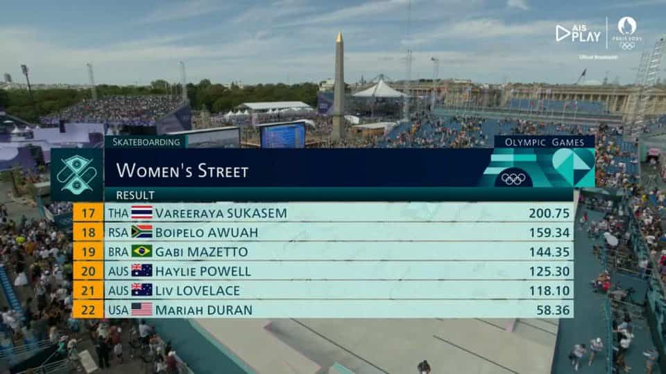 ผลการแข่งขันปรากฏว่า “เอสที” วารีรยา สุขเกษม นักสเก็ตบอร์ดสาวน้อยทีมชาติไทย พยายามเล่นท่าเพื่อทำคะแนน ก่อนทำได้ 200.75 คะแนน ก่อนจบเป็นอันดับที่ 17 ในการแข่งขันสเก็ตบอร์ด ประเภทสตรีท หญิง กีฬาโอลิมปิกเกมส์ ครั้งที่ 33 ที่กรุงปารีส ประเทศฝรั่งเศส