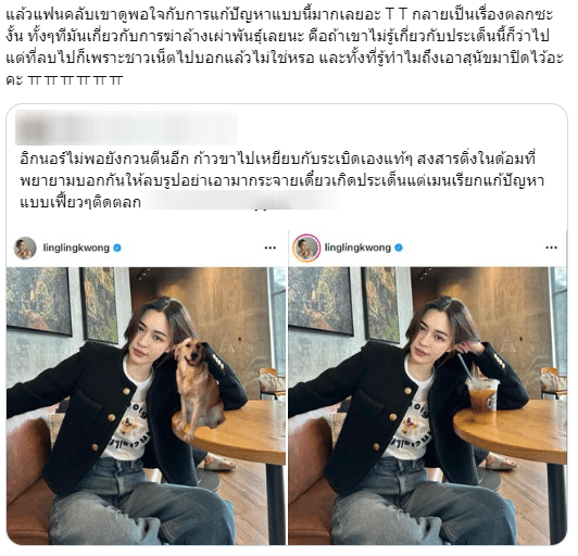 ทั้งนี้ หลิงหลิงยังไม่ได้ออกมาชี้แจงถึงสาเหตุที่ลบภาพและโพสต์ใหม่ ทำให้ชาวเน็ตยิ่งไม่พอใจและเรียกร้องให้เธอออกมาแสดงความรับผิดชอบต่อเหตุการณ์ที่เกิดขึ้น