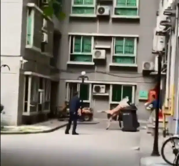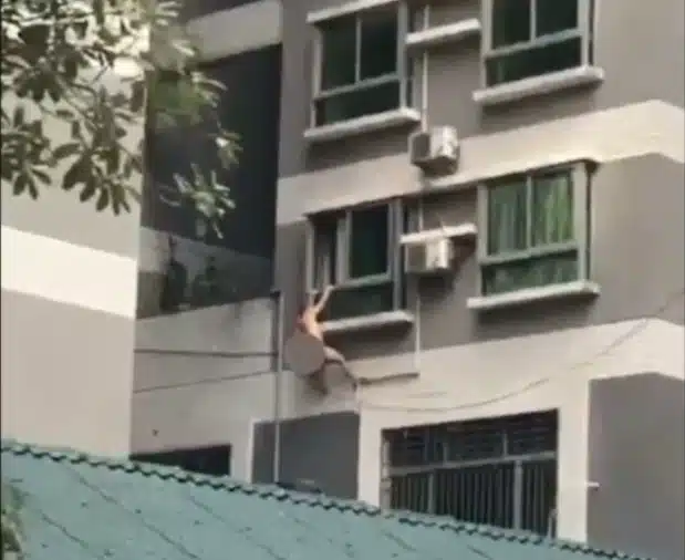 ในวิดีโอที่แชร์อย่างมากมายในโลกอินเตอร์เน็ต บันทึกภาพตอนผู้เห็นเหตุการณ์ตกตะลึงส่งเสียงกรีดร้อง ขณะชายคนนั้นพยายามซ่อนตัวและห้อยตัวลงมาจากหน้าต่างชั้น 4 ก่อนจะร่วงลงสู่ถังขยะที่อยู่ด้านล่างอย่างน่าหวาดเสียว ไม่สวมเสื้อผ้าใดๆ ทั้งสิ้น โดยกระดูกสันหลังได้รับบาดเจ็บรุนแรง