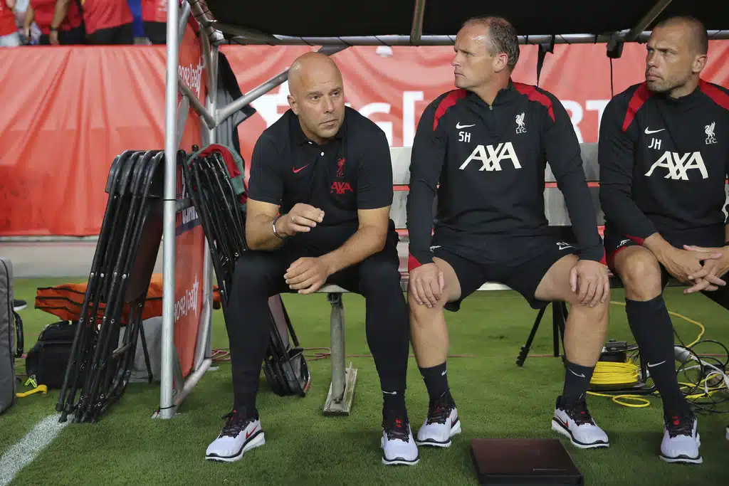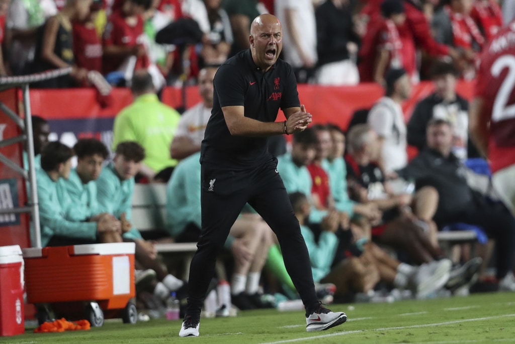 Liverpool manager Arne Slot, center, urges his team to pressure the ball during the second half of an international friendly soccer match against Manchester United, Saturday, Aug. 3, 2024, in Columbia, S.C. (AP Photo/Artie Walker Jr.)
