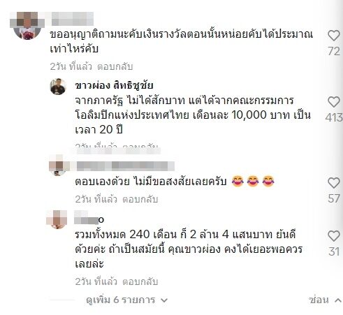 โดยมีหนึ่งคนได้ถามว่า “เงินรางวัลตอนนั้นได้ประมาณเท่าไหร่?” ซึ่งตัวของ ขาวผ่อง สิทธิชูชัย ได้ออกมาตอบด้วยตัวเองว่า “จากภาครัฐ ไม่ได้สักบาท แต่ได้จากคณะกรรมการโอลิมปิกแห่งประเทศไทย เดือนละ 10,000 บาท เป็นเวลา 20 ปี”