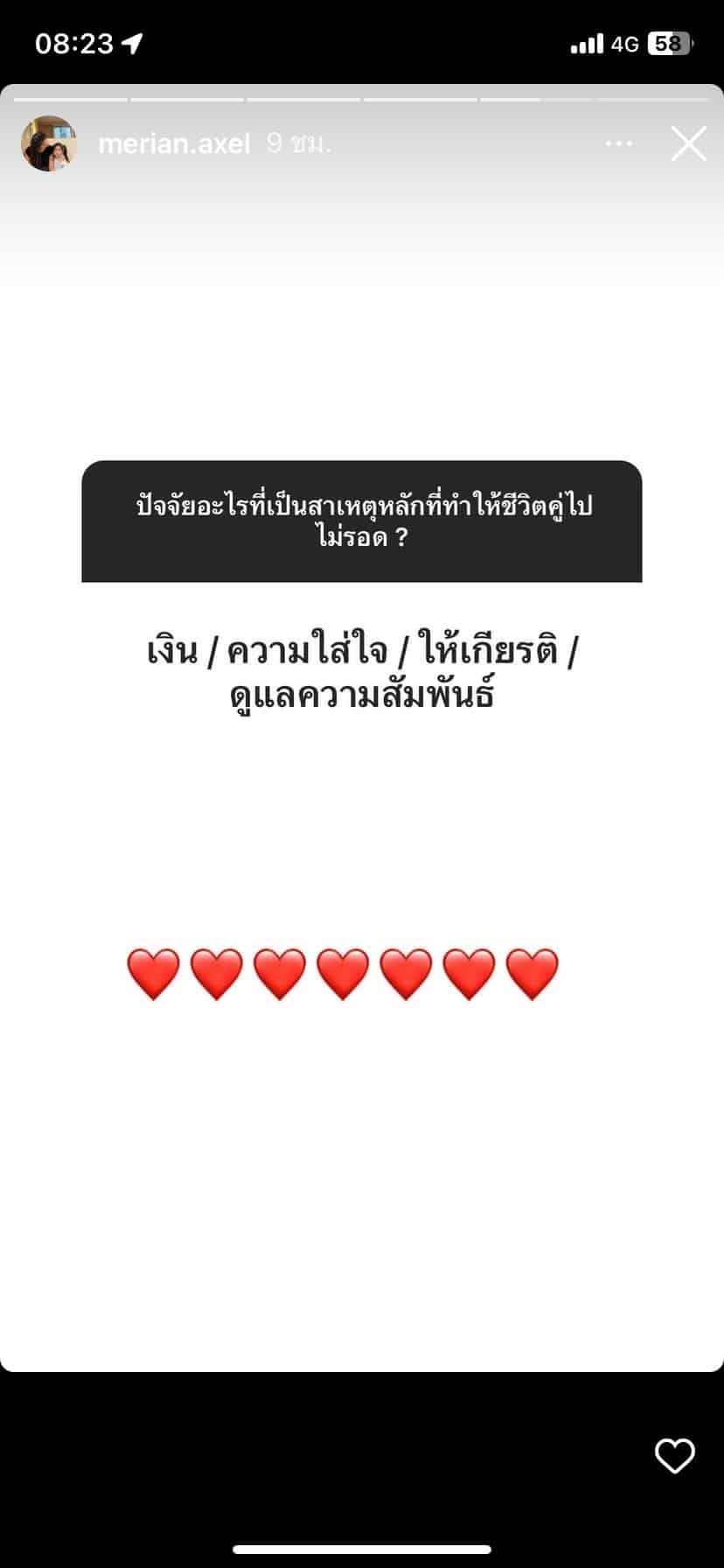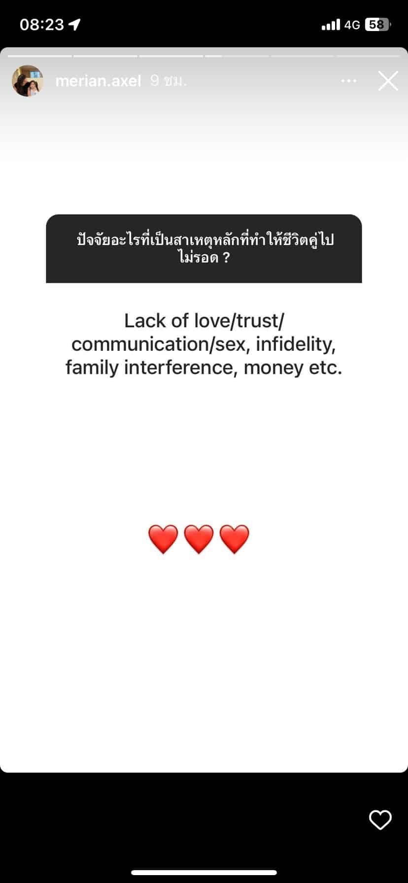 ล่าสุดช่วงกลางดึกที่ผ่านมา (6 ส.ค. 67) สาวมิเรียน ก็ตั้งคำถามผ่านสตอรี่ไอจีส่วนตัว ระบุว่า “ปัจจัยอะไรที่เป็นสาเหตุหลักที่ทำให้ชีวิตคู่ไปไม่รอด?” พร้อมแปะแคปชั่นประกอบเอาไว้ว่า “กำลังเขียนนิยาย ขอความเก็นหน่อยค่ะ?” ซึ่งก็คงมีทั้งคนรู้จักและผู้ติดตามของเธอตอบคำถามดังกล่าวกันอย่างมากมาย แต่เจ้าตัวกลับแชร์ความเห็นจากแค่บางคนเท่านั้นที่ตอบมาในทำนองเดียวกัน คือ “ผช.ไม่ซื่อสัตย์, เงิน, ความใส่ใจ, ให้เกียรติ และดูแลความสัมพันธ์”