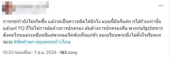 “การกระทำยังไม่เกิดขึ้น แล้วจะเป็นความผิดได้ยังไง แบบนี้มันก็แค่การใส่ร้ายเท่านั้น แล้วแก้ 112 ก็ไม่ใช่การล้มล้างการปกครอง ล้มล้างการปกครองคือ พวกก่อรัฐประหาร สังคมไทยแม่งเหมือนมีแต่พวกลอจิคพังเห็นแก่ตัว ตอนเรียนพวกมึงไม่ตั้งใจเรียนเหรอวะ #คัดค้านการยุบพรรคก้าวไกล”