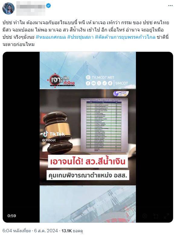 “ประชาชนทำไมต้องมาเจอกับอะไรแบบนี้ หนี เห้ มาเจอ เห้กว่า กรรมของปชช. คนไทยมี สว. จอมปลอม ไม่พอ มาเจอ สว. สีน้ำเงินเข้าไปอีก เมื่อไหร่อำนาจจะอยู่ในมือประชาชนจริง ๆ มั่งนะ ชาตินี่จะตายก่อนไหม”