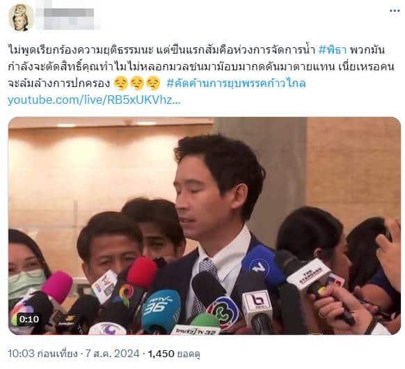 นอกจากนี้ บนโซเชียลยังมีการแชร์บทสัมภาษณ์ล่าสุดของพิธา ลิ้มเจริญรัตน์ ก่อนจะฟังผลคำวินิจฉัย พร้อมกับเขียนเนื้อหาแสดงความเห็นว่า “ไม่พูดเรียกร้องความยุติธรรมนะ แต่ซีนแรกสัมคือห่วงการจัดการน้ำ #พิธา พวกมันกำลังจะตัดสิทธิ์คุณ ทำไมไม่หลอกมวลชนมาม๊อบ มากดดันมาตายแทน เนี่ยเหรอคนจะล้มล้างการปกครอง”