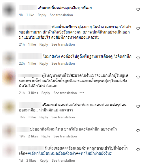 งานนี้ทำเอาบรรดาพ่อแม่ที่เคยพาลูกเข้าห้องน้ำเด็กต่างก็เข้าใจหัวอกคนเป็นแม่กันเป็นอย่างดี พร้อมทั้งร่วมกันประณามพฤติกรรมเห็นแก่ตัวของผู้ใหญ่บางคนที่ไม่เคารพกฎระเบียบและสิทธิของผู้อื่น ทั้งนี้ยังมองว่าเป็นการกระทำที่สะท้อนคุณภาพประชากรไทยที่มักง่ายและไร้จิตสำนึก อาทิเช่น