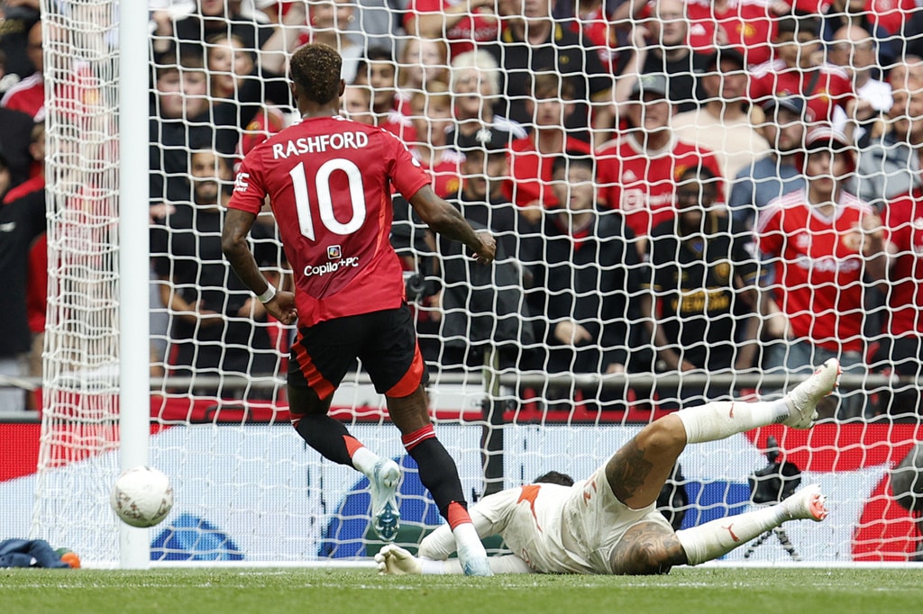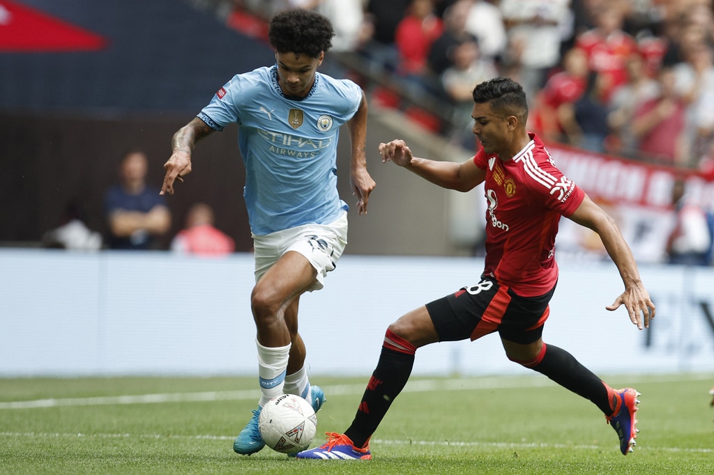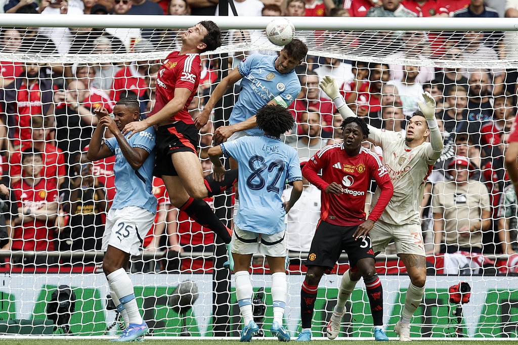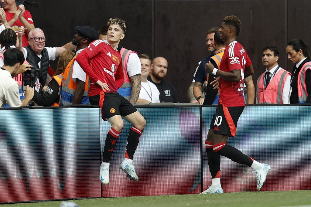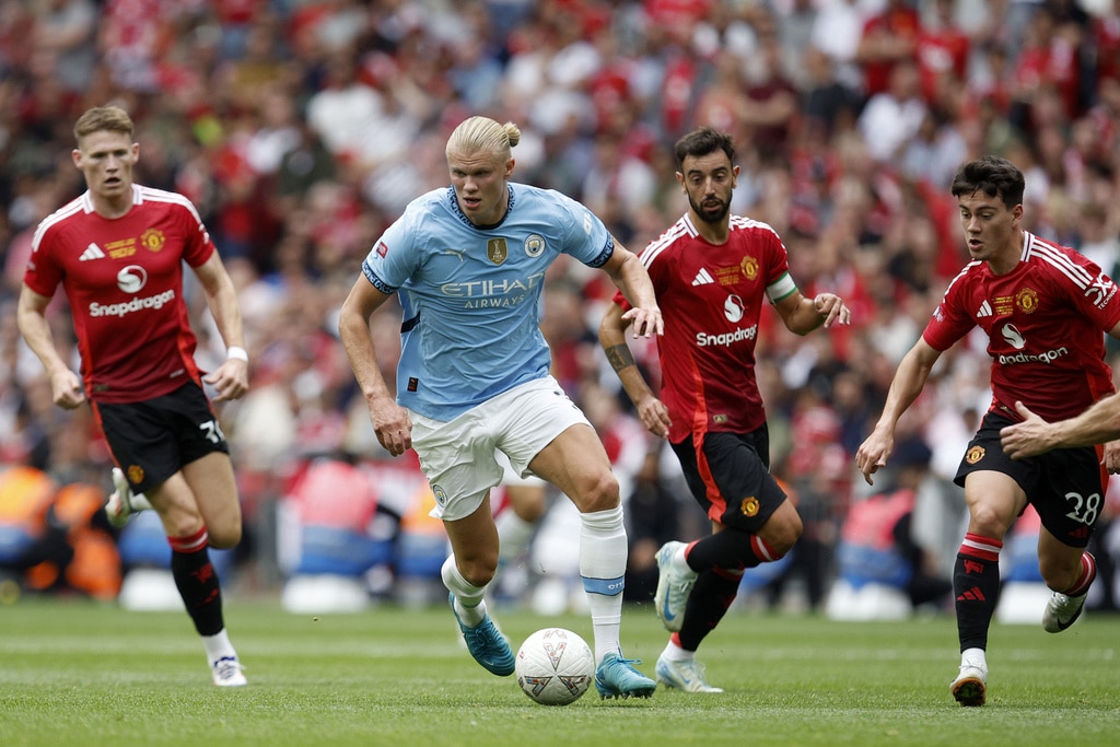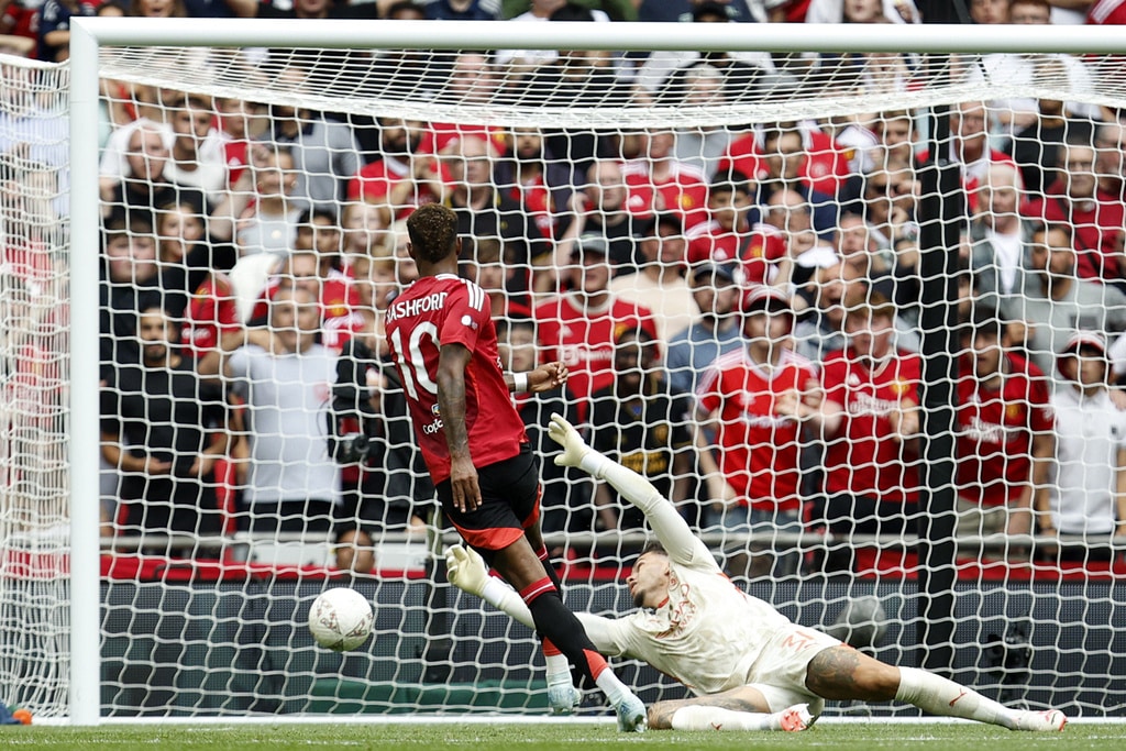Manchester United midfielder Mason Mount , from left, Manchester City midfielder Nico O’Reilly and Manchester United midfielder Kobbie Mainoo challenge for the ball during the FA Community Shield final soccer match between Manchester City and Manchester United at Wembley Stadium in London, Saturday, Aug. 10, 2024. (AP Photo/David Cliff)Manchester United players stand together during the penaty shootout during the FA Community Shield soccer match between Manchester City and Manchester United at Wembley Stadium in London, Saturday, Aug. 10, 2024. (AP Photo/David Cliff)Manchester City midfielder Bernardo Silva celebrates scoring his side’s first goal during the FA Community Shield soccer match between Manchester City and Manchester United at Wembley Stadium in London, Saturday, Aug. 10, 2024. (AP Photo/David Cliff)Manchester United forward Alejandro Garnacho, left, and Manchester United forward Marcus Rashford celebrate after scoring their side’s first goal during the FA Community Shield soccer match between Manchester City and Manchester United at Wembley Stadium in London, Saturday, Aug. 10, 2024. (AP Photo/David Cliff)Manchester United forward Marcus Rashford fails to score during the FA Community Shield soccer match between Manchester City and Manchester United at Wembley Stadium in London, Saturday, Aug. 10, 2024. (AP Photo/David Cliff)Manchester United forward Marcus Rashford fails to score during the FA Community Shield soccer match between Manchester City and Manchester United at Wembley Stadium in London, Saturday, Aug. 10, 2024. (AP Photo/David Cliff)Manchester City forward Erling Haaland controls the ball during the FA Community Shield soccer match between Manchester City and Manchester United at Wembley Stadium in London, Saturday, Aug. 10, 2024. (AP Photo/David Cliff)Manchester United’s head coach Erik ten Hag gestures during the FA Community Shield soccer match between Manchester City and Manchester United at Wembley Stadium in London, Saturday, Aug. 10, 2024. (AP Photo/David Cliff)Manchester City midfielder Nico O’Reilly , left, and Manchester United midfielder Casemiro challenge for the ball during the FA Community Shield final soccer match between Manchester City and Manchester United at Wembley Stadium in London, Saturday, Aug. 10, 2024. (AP Photo/David Cliff)Manchester City defender Ruben Dias heads the ball during the FA Community Shield final soccer match between Manchester City and Manchester United at Wembley Stadium in London, Saturday, Aug. 10, 2024. (AP Photo/David Cliff)Manchester United midfielder Amad Diallo, left, and Manchester City defender Rico Lewis challenge for the ball during the FA Community Shield final soccer match between Manchester City and Manchester United at Wembley Stadium in London, Saturday, Aug. 10, 2024. (AP Photo/David Cliff)Manchester City midfielder Nico O’Reilly, left, and Manchester United midfielder Kobbie Mainoo challenge for the ball during the FA Community Shield final soccer match between Manchester City and Manchester United at Wembley Stadium in London, Saturday, Aug. 10, 2024. (AP Photo/David Cliff)