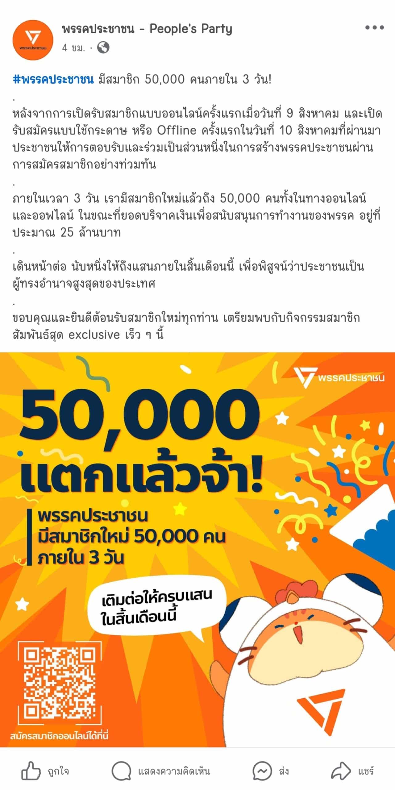 พรรคประชาชนยังคงตั้งเป้าหมายที่จะเพิ่มจำนวนสมาชิกให้ถึง 100,000 คนภายในสิ้นเดือนนี้ พร้อมกับเตรียมจัดกิจกรรมพิเศษเพื่อสร้างความสัมพันธ์ระหว่างสมาชิกใหม่และพรรค