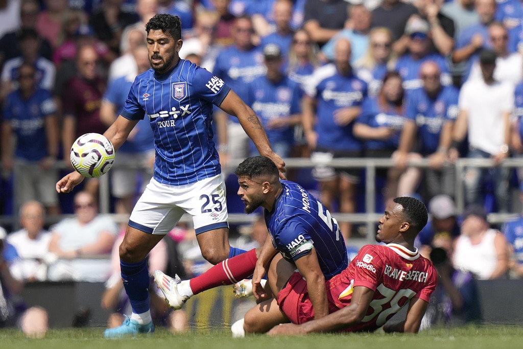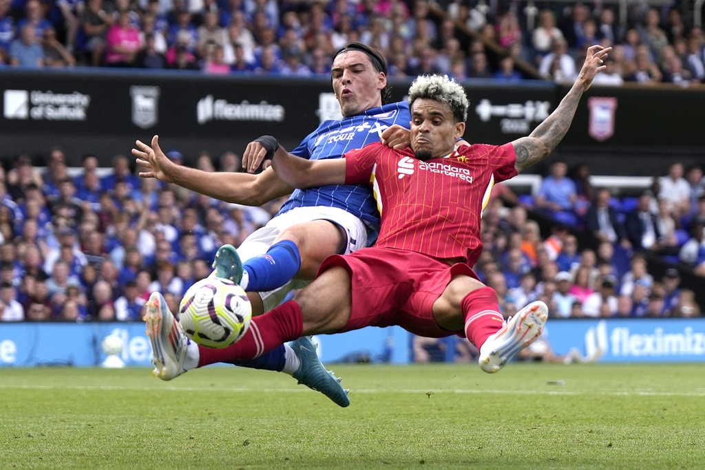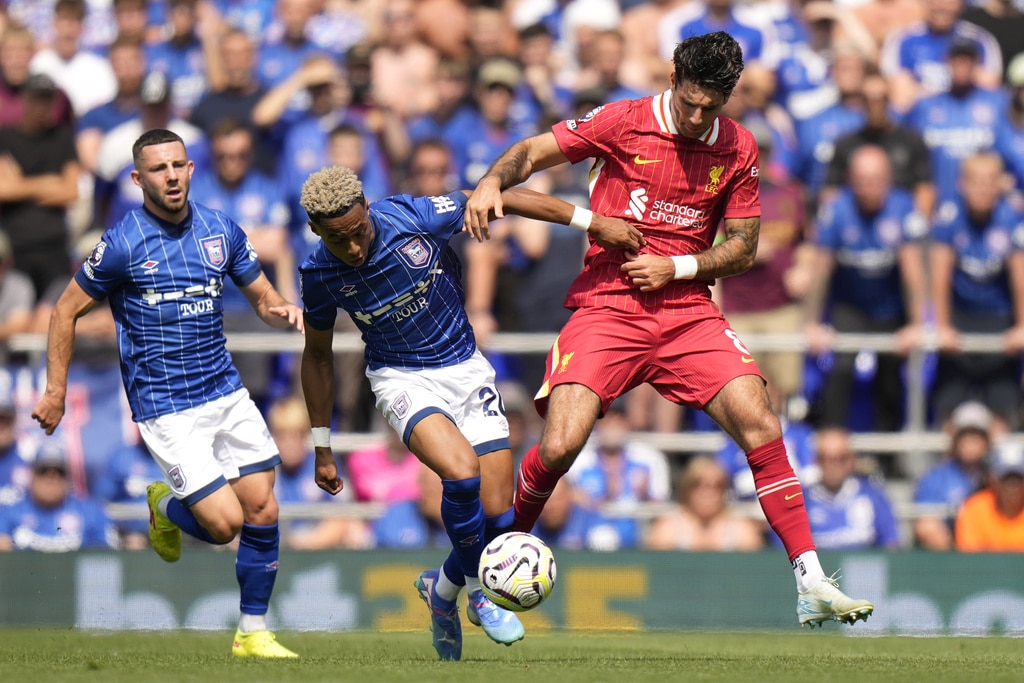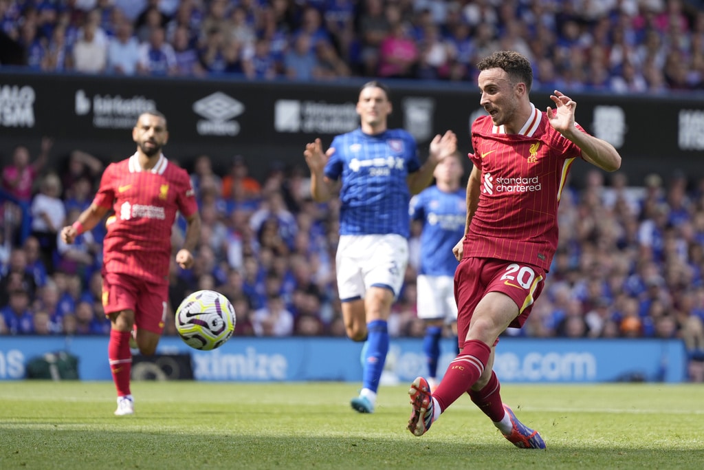 Ipswich Town’s Omari Hutchinson, left, vies for the ball with Liverpool’s Dominik Szoboszlai during the English Premier League soccer match between Ipswich Town and Liverpool at Portman Road stadium in Ipswich, England, Saturday, Aug. 17, 2024. (AP Photo/Alastair Grant)Liverpool’s Luis Diaz, right, vies for the ball Ipswich Town’s Jacob Greaves during the English Premier League soccer match between Ipswich Town and Liverpool at Portman Road stadium in Ipswich, England, Saturday, Aug. 17, 2024. (AP Photo/Alastair Grant)Liverpool’s Mohamed Salah, center, celebrates after he scores his side’s second goal during the English Premier League soccer match between Ipswich Town and Liverpool at Portman Road stadium in Ipswich, England, Saturday, Aug. 17, 2024. (AP Photo/Alastair Grant)Liverpool’s Mohamed Salah, left, celebrates after he scores his side’s second goal during the English Premier League soccer match between Ipswich Town and Liverpool at Portman Road stadium in Ipswich, England, Saturday, Aug. 17, 2024. (AP Photo/Alastair Grant)Liverpool’s Mohamed Salah scores his side’s second goal during the English Premier League soccer match between Ipswich Town and Liverpool at Portman Road stadium in Ipswich, England, Saturday, Aug. 17, 2024. (AP Photo/Alastair Grant)Liverpool’s Diogo Jota, second right, celebrates after he scores his side’s first goal during the English Premier League soccer match between Ipswich Town and Liverpool at Portman Road stadium in Ipswich, England, Saturday, Aug. 17, 2024. (AP Photo/Alastair Grant)Liverpool’s Diogo Jota celebrates after he scores his side’s first goal during the English Premier League soccer match between Ipswich Town and Liverpool at Portman Road stadium in Ipswich, England, Saturday, Aug. 17, 2024. (AP Photo/Alastair Grant)Ipswich Town’s Liam Delap, left, vies for the ball with Liverpool’s Jarell Quansah during the English Premier League soccer match between Ipswich Town and Liverpool at Portman Road stadium in Ipswich, England, Saturday, Aug. 17, 2024. (AP Photo/Alastair Grant)Ipswich Town’s Massimo Luongo, left, vies for the ball Liverpool’s Ryan Gravenberch, right, during the English Premier League soccer match between Ipswich Town and Liverpool at Portman Road stadium in Ipswich, England, Saturday, Aug. 17, 2024. (AP Photo/Alastair Grant)Liverpool’s Diogo Jota scores his side’s first goal during the English Premier League soccer match between Ipswich Town and Liverpool at Portman Road stadium in Ipswich, England, Saturday, Aug. 17, 2024. (AP Photo/Alastair Grant)