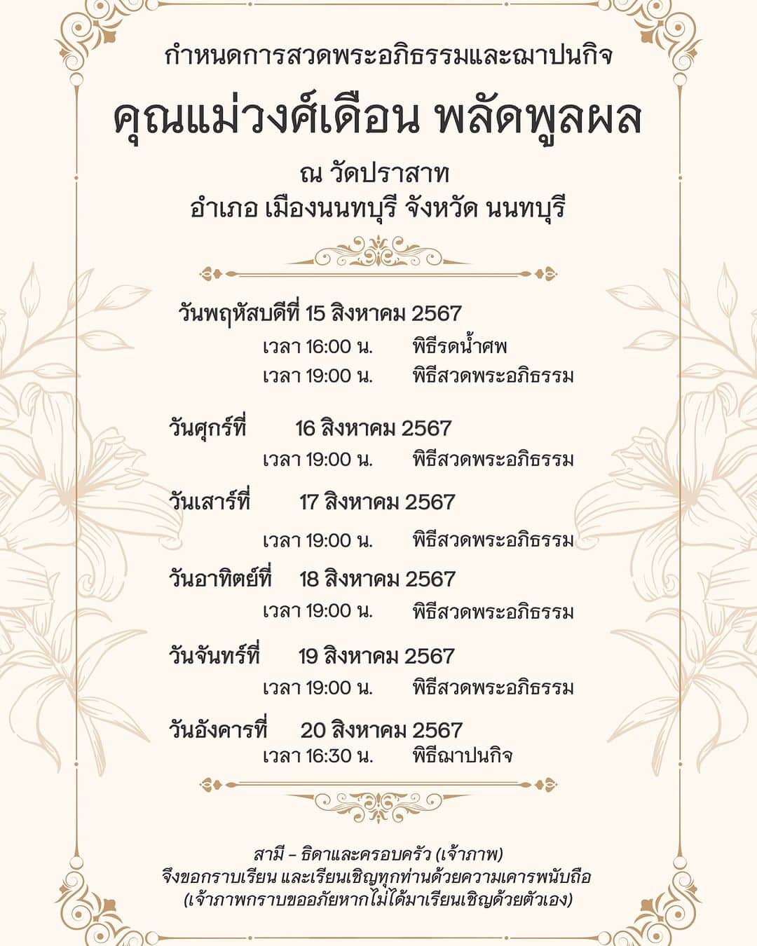 นับว่าเป็นการสูญเสียครั้งใหญ่ในชีวิตสำหรับการจากไปอย่างกะทันหันของ “คุณแม่วงศ์เดือน” แม่ของ กระแต เสาวคนธ์ ภรรยาคนเก่งของนักแสดงและผู้จัดมากฝีมือ เติ้ล ตะวัน ซึ่งทางเจ้าตัวได้ออกมาแจ้งข่าวเศร้านี้ผ่านทางอินสตาแกรมส่วนตัว ระบุ “แม่ไปเป็นนางฟ้าแล้ว อย่าไปแกล้งใครบนสวรรค์นะ รักแม่ที่สุดคนเก่งของหนู 14.08.2024”