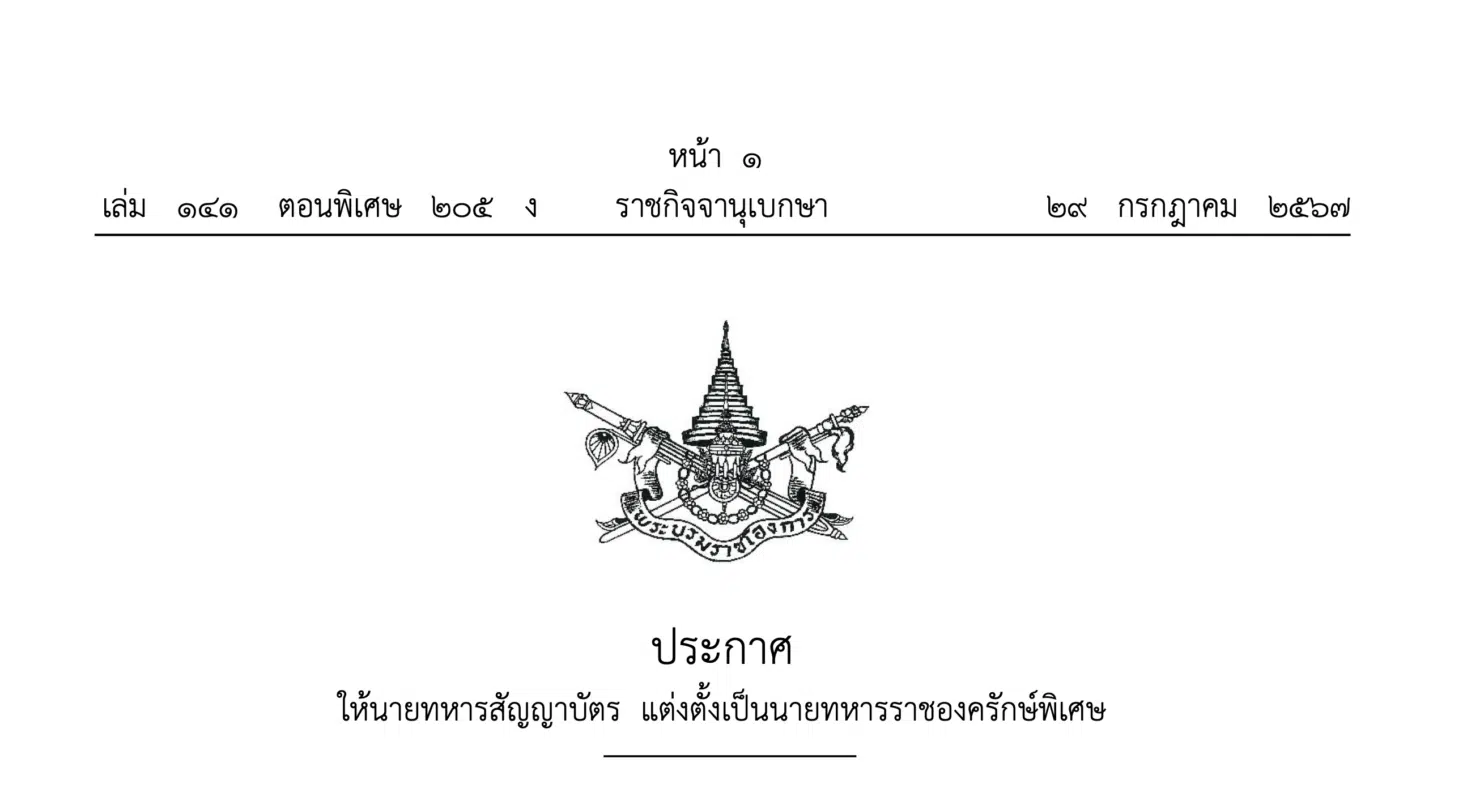 วันที่ 29 กรกฎาคม 2567 เว็บไซต์ราชกิจจานุเบกษา เผยแพร่ประกาศ ให้นายทหารสัญญาบัตร แต่งตั้งเป็นนายทหารราชองครักษ์พิเศษ จำนวน 5 นาย