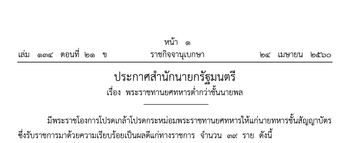 เมื่อวันที่ 21 เมษายน 2560 ราชกิจจาบุเบกษา ประกาศ สำนักนายกรัฐมนตรี เรื่อง พระราชทานยศทหารต่ำกว่าชั้นนายพล มีพระราชโองการโปรดเกล้าโปรดกระหม่อมพระราชทานยศทหารให้แก่นายทหารชั้นสัญญาบัตรซึ่งรับราชการมาด้วยความเรียบร้อยเป็นผลดีแก่ทางราชการจำนวน 39 ราย