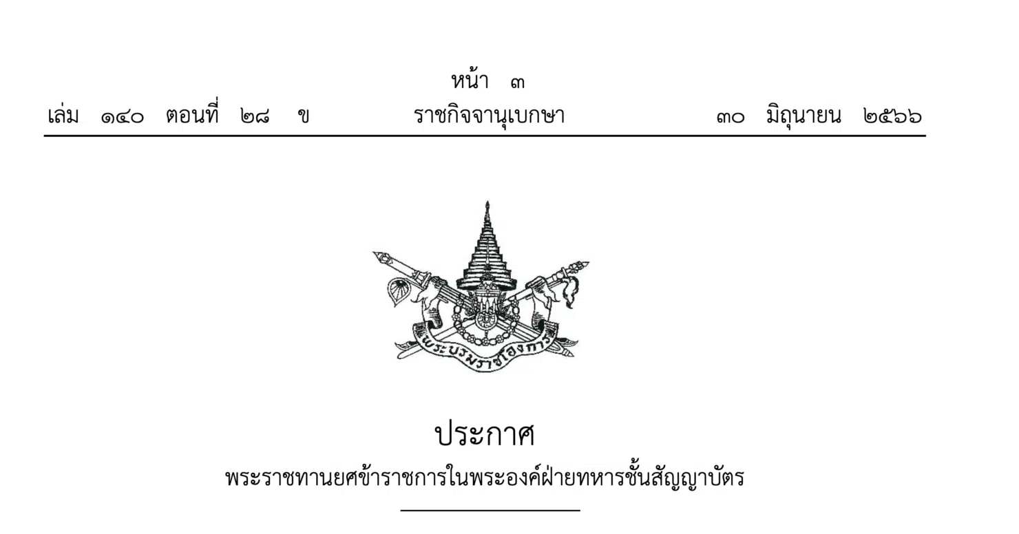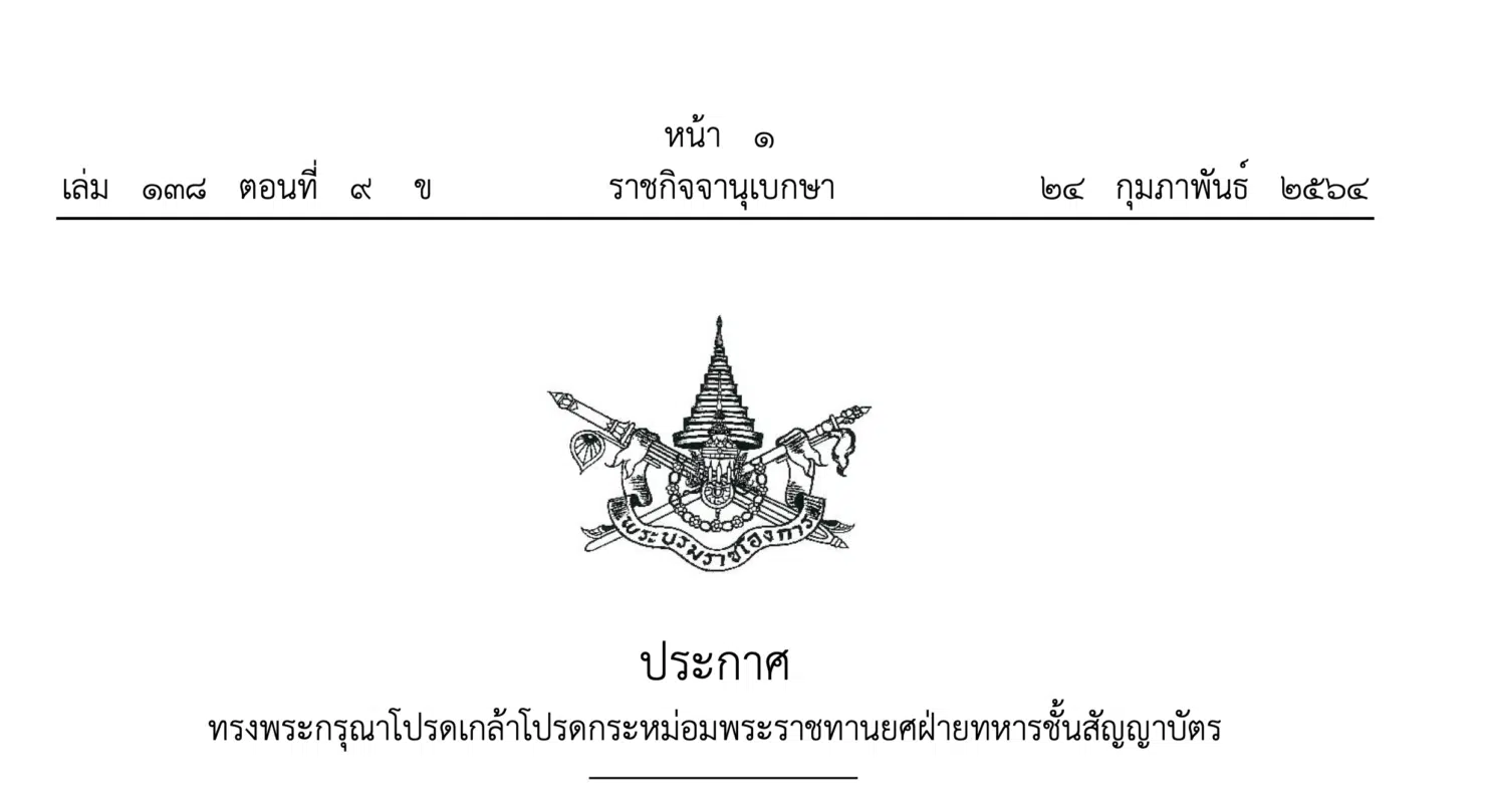 วันที่ 24 กุมภาพันธ์ 2564 เว็บไซต์ราชกิจจานุเบกษา เผยแพร่ประกาศ ทรงพระกรุณาโปรดเกล้าโปรดกระหม่อมพระราชทานยศฝ่ายทหารชั้นสัญญาบัตร ความว่า พระบาทสมเด็จพระปรเมนทรรามาธิบดีศรีสินทรมหาวชิราลงกรณ พระวชิรเกล้าเจ้าอยู่หัว มีพระบรมราชโองการโปรดเกล้าโปรดกระหม่อมพระราชทานยศฝ่ายทหารสัญญาบัตรต่ำกว่าชั้นนายพล