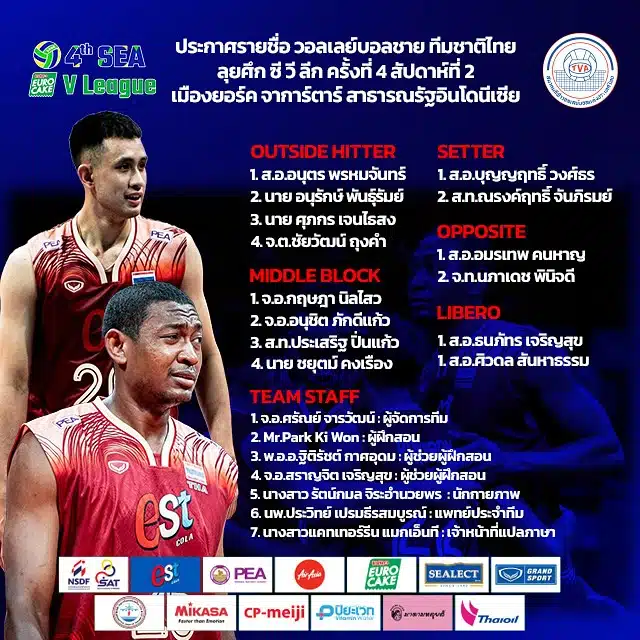 เผย 14 รายชื่อ นักวอลเลย์บอลชายทีมชาติไทย ลุย ซี วี.ลีก 2024 (Sea V.League 2024) สัปดาห์ที่ 2 ที่ประเทศอินโดนีเซีย
