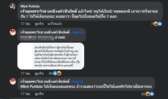 ขณะที่เพจเจ้าพระคุณโรสก็ได้เข้ามาแสดงความคิดเห็นใต้โพสต์ของมิ้นต์ว่า “เปิดละหรอตอนแรกปิด , บุกเข้ามาก็เลยแxx..xให้เxxเลย เออมึงเริสเนอะ ละนี่ไม่มีใครจ้างกูค่ะ สตินะคะ , เรารู้ตลอดว่าเขามีเมียละมัน3 รอบแล้วแค่รอบที่4 หนูไม่ได้เงินแสนเลยส่งไปขู่เมียเขาอ่ะโดนฟ้องมาไม่คุ้มนะหนู” นอกจากนั้นยังปาแชตที่มิ้นต์ทักไปหาเมียของฝ่ายชายใส่คอมเมนต์ให้ชาวเน็ตได้ดูเพิ่มเติมกันด้วย