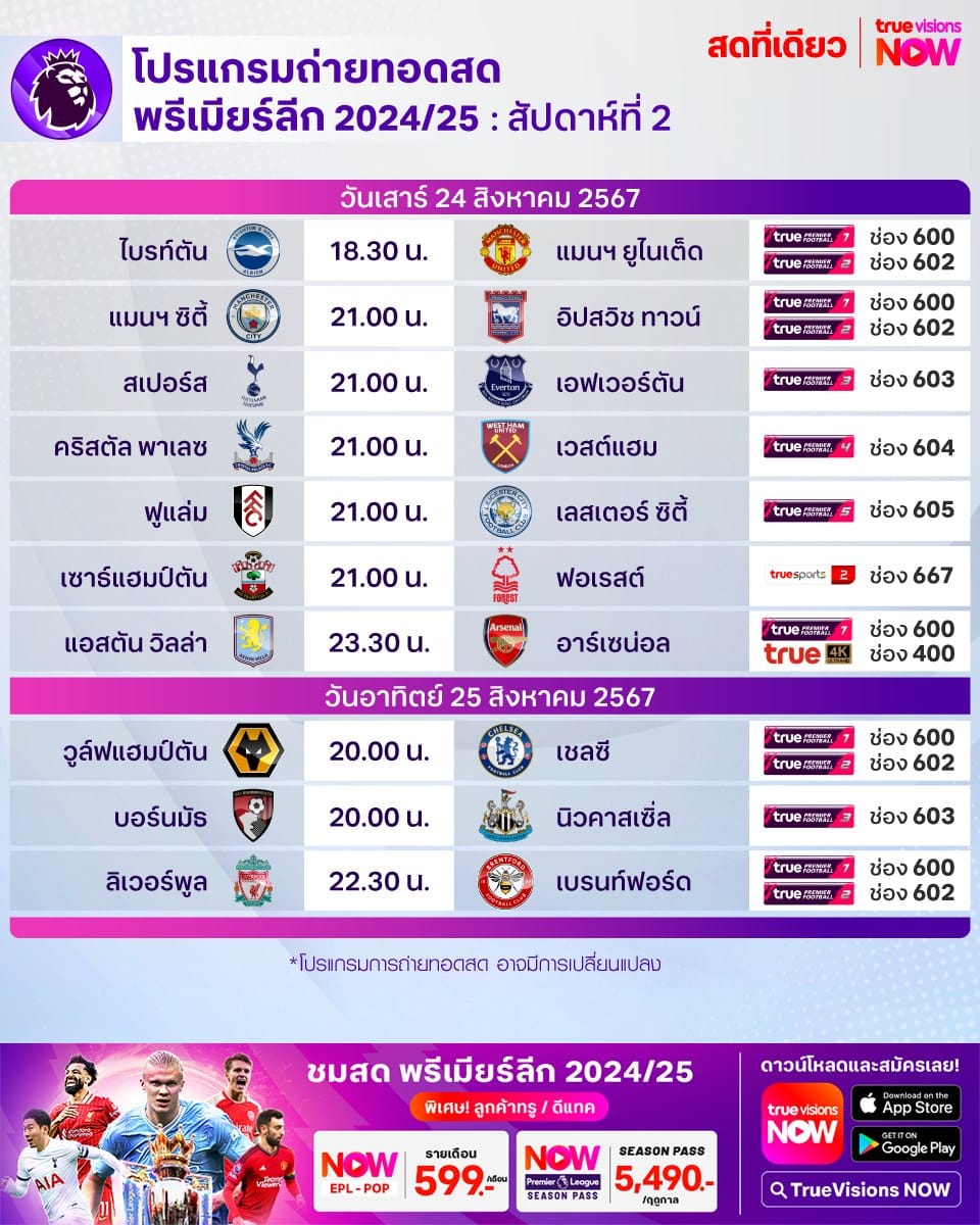 โปรแกรมพรีเมียร์ลีก 2024/25 สัปดาห์ที่ 2 วันที่ 24-25 ส.ค. นี้ ตารางแข่งพร้อมช่องดูบอลสด
