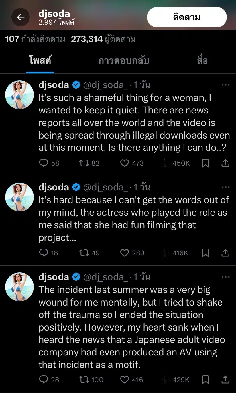 ดีเจโซดา ร่ายยาวตัดพ้อความเจ็บปวดเป็น 3 ภาษา หลังรู้ข่าวว่า เหตุการณ์ที่เธอโดนลวนลาม ถูกเอาไปทำหนัง AV ฉายในประเทศญี่ปุ่น