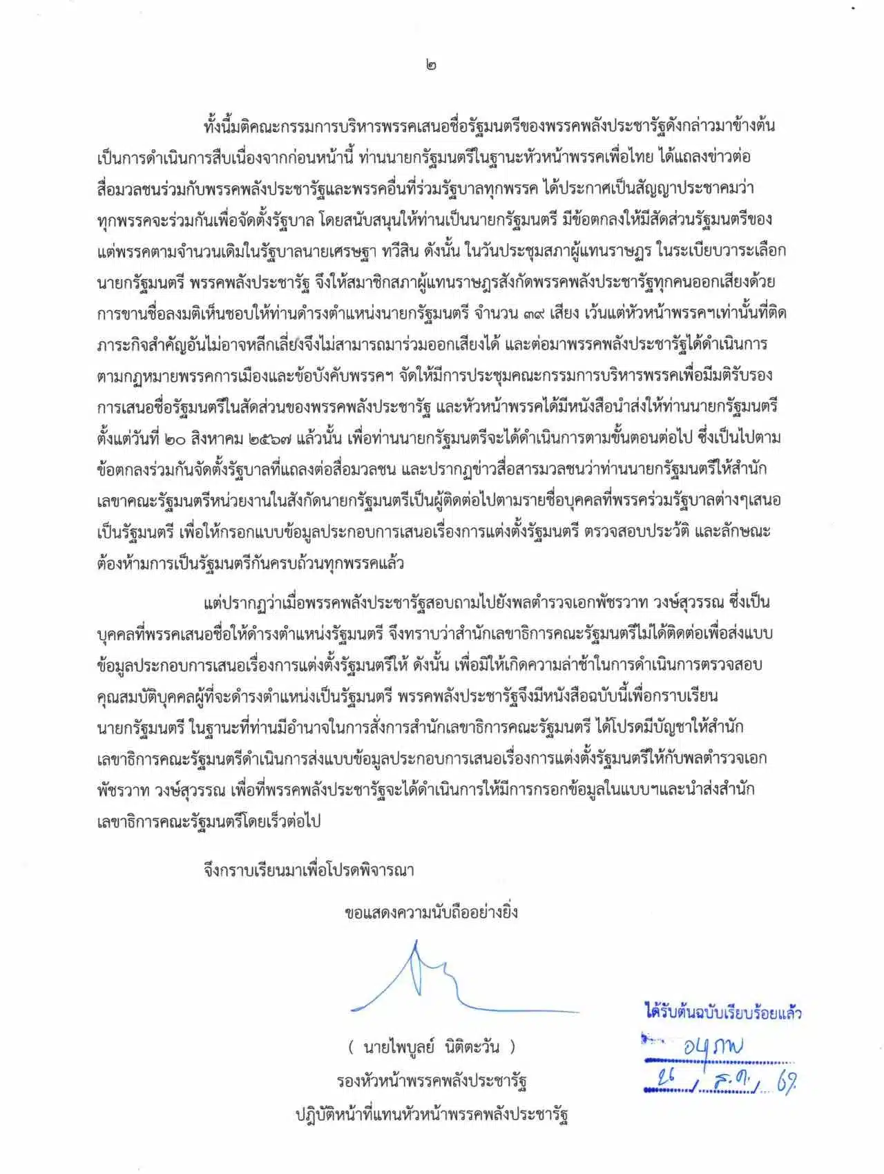 จึงไม่สามารถมาร่วมออกเสียงได้ และต่อมาพรรคพลังประชารัฐได้ดําเนินการตามกฎหมายพรรคการเมืองและข้อบังคับพรรคฯ จัดให้มีการประชุมคณะกรรมการบริหารพรรคเพื่อมีมติรับรองการเสนอชื่อรัฐมนตรีในสัดส่วนของพรรคพลังประชารัฐ และหัวหน้าพรรคได้มีหนังสือนําส่งให้ท่านนายกรัฐมนตรี ตั้งแต่วันที่ 20 สิงหาคม 2567 แล้วนั้น เพื่อท่านนายกรัฐมนตรีจะได้ดําเนินการตามขั้นตอนต่อไป ซึ่งเป็นไปตามข้อตกลงร่วมกันจัดตั้งรัฐบาลที่แถลงต่อสื่อมวลชน และปรากฏข่าวจากสื่อสารมวลชนว่า ท่านนายกรัฐมนตรีให้สํานักเลขาฯ คณะรัฐมนตรี หน่วยงานในสังกัดนายกรัฐมนตรีเป็นผู้ติดต่อไปตามรายชื่อบุคคลที่พรรคร่วมรัฐบาลต่างๆ เสนอ เป็นรัฐมนตรี เพื่อให้กรอกแบบข้อมูลประกอบการเสนอเรื่องการแต่งตั้งรัฐมนตรี ตรวจสอบประวัติ และลักษณะต้องห้ามการเป็นรัฐมนตรีกันครบถ้วนทุกพรรคแล้ว