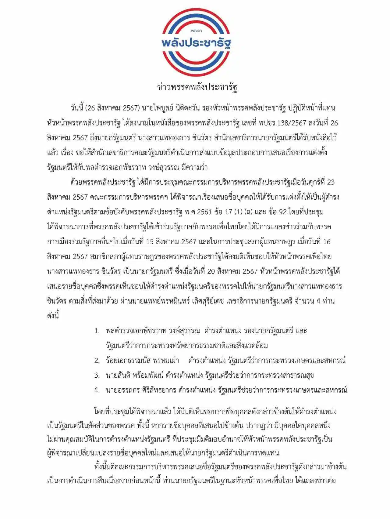 ด้วย พรรคพลังประชารัฐ ได้มีการประชุมคณะกรรมการบริหารพรรคพลังประชารัฐ เมื่อวันศุกร์ที่ 23 สิงหาคม 2567 คณะกรรมการบริหารพรรคฯ ได้พิจารณาเรื่องเสนอชื่อบุคคลให้ได้รับการแต่งตั้งให้เป็นผู้ดํารงตําแหน่งรัฐมนตรีตามข้อบังคับพรรคพลังประชารัฐ พ.ศ. 2561 ข้อ 17 (1) (2) และ ข้อ 92 โดยที่ประชุมได้พิจารณาการที่พรรคพลังประชารัฐได้เข้าร่วมรัฐบาลกับพรรคเพื่อไทย โดยได้มีการแถลงข่าวร่วมกับพรรคการเมืองร่วมรัฐบาลอื่นๆ ไป เมื่อวันที่ 15 สิงหาคม 2567 และในการประชุมสภาผู้แทนราษฎร เมื่อวันที่ 16 สิงหาคม 2567 สมาชิกสภาผู้แทนราษฎรของพรรคพลังประชารัฐได้ลงมติเห็นชอบให้หัวหน้าพรรคเพื่อไทย นางสาวแพทองธาร ชินวัตร เป็นนายกรัฐมนตรี ซึ่งเมื่อวันที่ 20 สิงหาคม 2567 หัวหน้าพรรคพลังประชารัฐได้เสนอรายชื่อบุคคลซึ่งพรรคเห็นชอบให้ดํารงตําแหน่งรัฐมนตรีของพรรคไปให้นายกรัฐมนตรี นางสาวแพทองธาร ชินวัตร ตามสิ่งที่ส่งมาด้วย ผ่าน นายแพทย์พรหมินทร์ เลิศสุริย์เดช เลขาธิการนายกรัฐมนตรี จํานวน 4 ท่าน