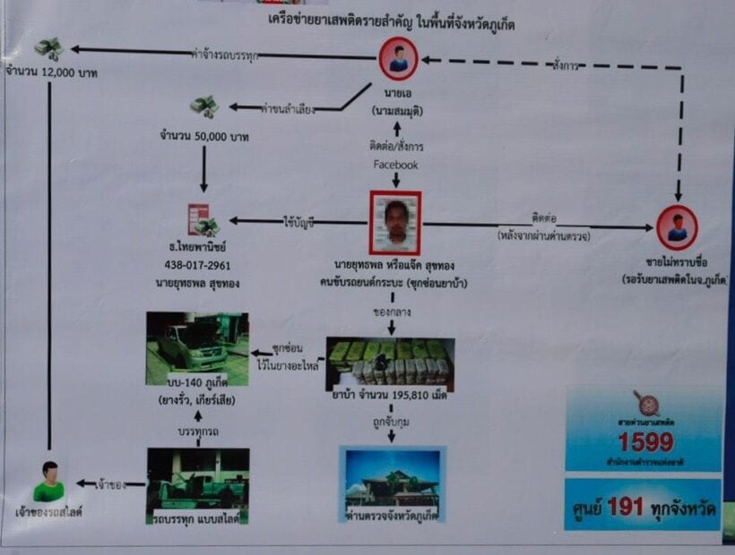 ทั้งนี้ พล.ต.ต.นันทเดช เปิดเผยว่า การจับกุมดังกล่าวสืบเนื่องจากที่ เจ้าหน้าที่ตำรวจชุดปราบปรามยาเสพติด ตำรวจภูธรจังหวัดภูเก็ตซึ่งได้รับแจ้งทางการข่าวว่า มีกลุ่มเครือข่ายผู้ค้ายาเสพติดรายสำคัญ ที่มีพฤติการณ์ณ์ขนส่งลำเลียงยาเสพติดจำนวนมาก โดยใช้วิธีการ ทำทีว่ารถชำรุดเสียหายไม่สามารถขับขี่ไปได้ แล้วติดต่อรถบรรทุกสไลด์ ให้ทำการบรรทุกรถกะบะที่ได้ซุกซ่อนยาเสพติดมากับรถ เพื่อหลีกเลี่ยงการตรวจสอบของเจ้าหน้าที่ตำรวจ ลำเลียงเข้าสู่จังหวัภูเก็ต พ.ต.อ.อกนิษฐ ด่านพิทักษ์ศาสน์