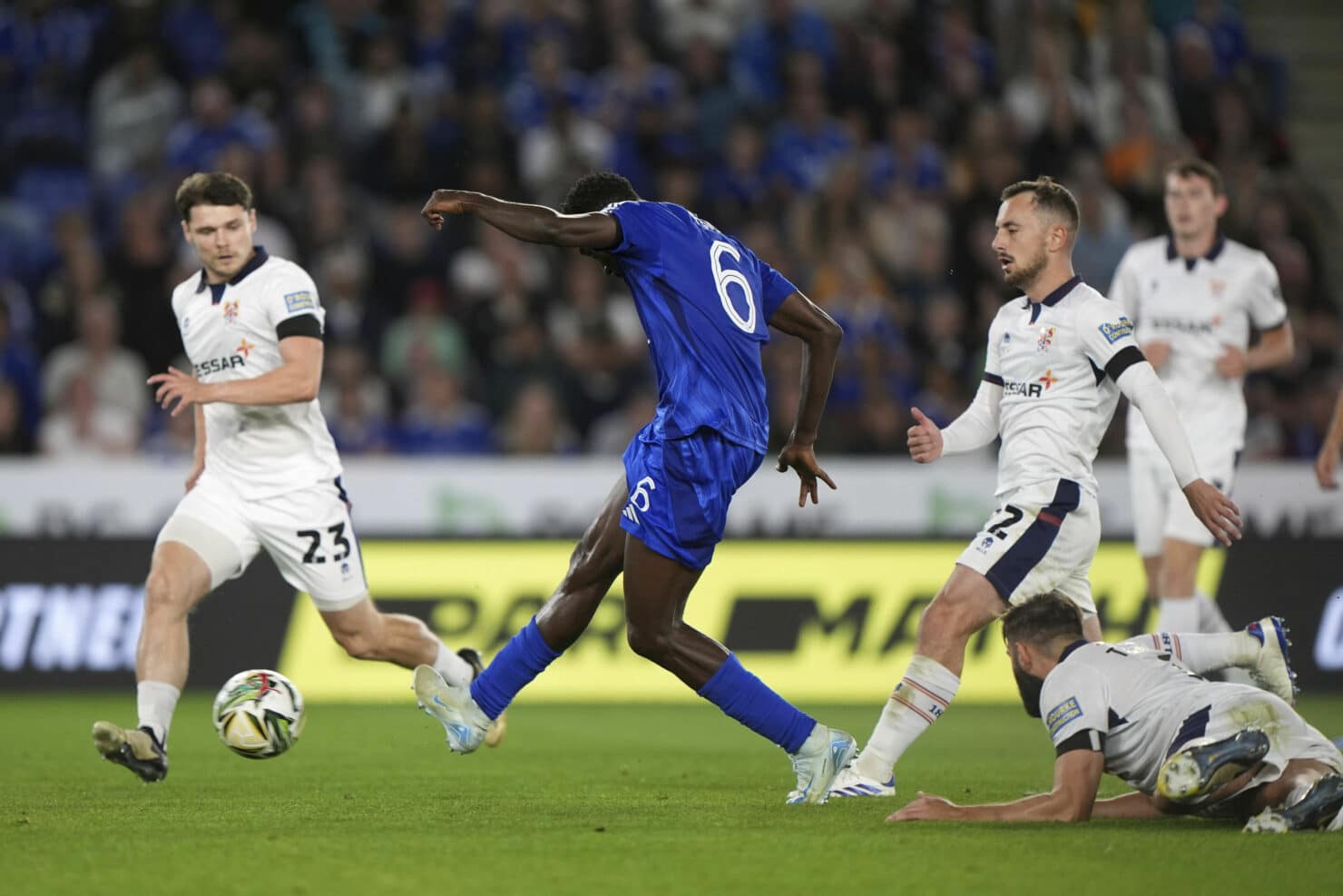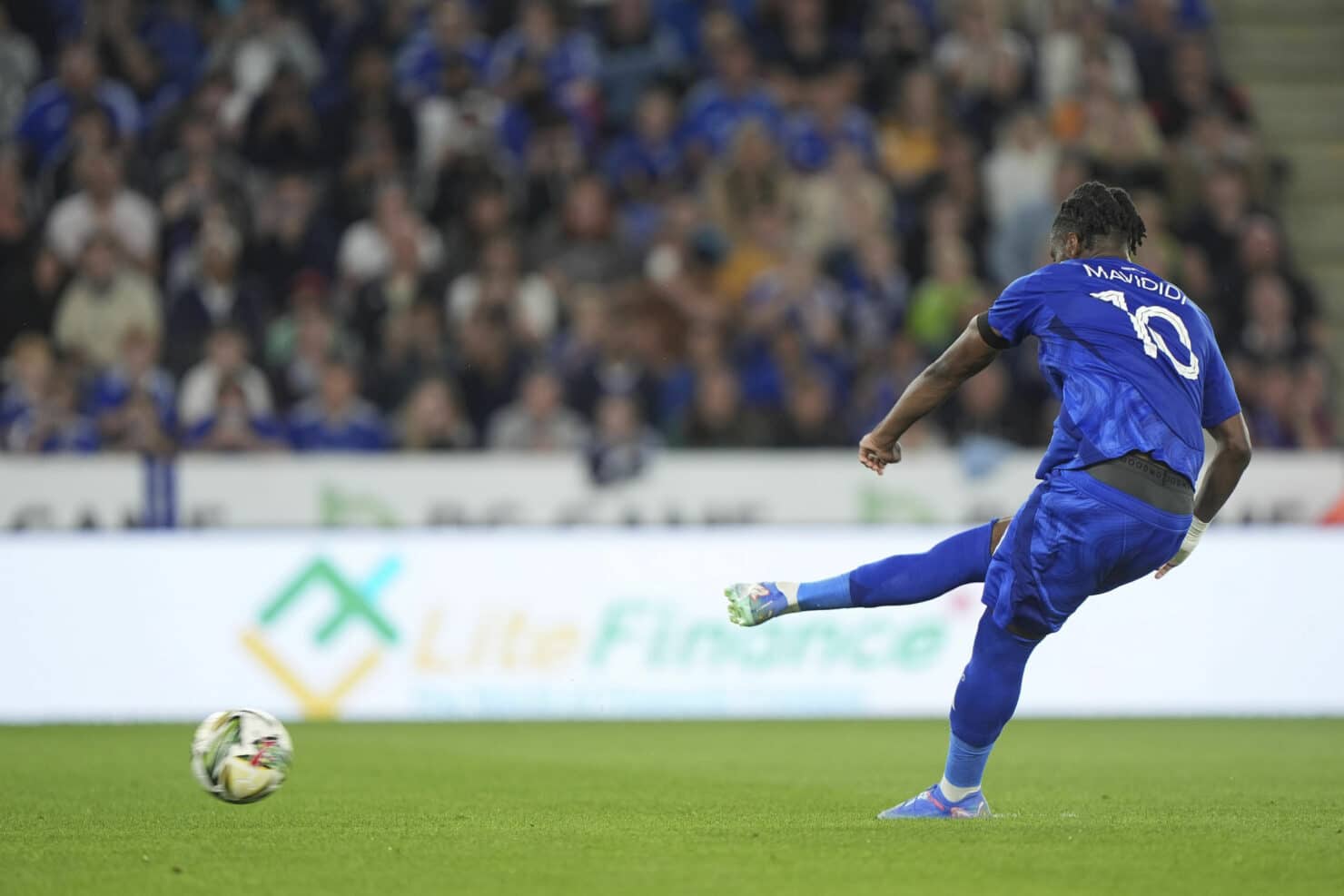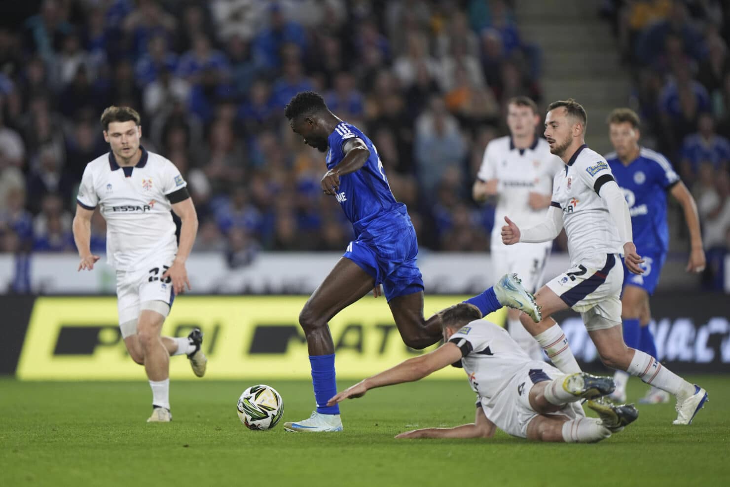 Leicester City’s Wilfred Ndidi, right, wins the ball before scoring his side’s third goal of the game during the English League Cup soccer match between Leicester City and Tranmere Rovers at the King Power Stadium, Leicester, England, Tuesday Aug 27, 2024. (Joe Giddens/PA via AP)Leicester City’s Wilfred Ndidi, center, scores their side’s third goal of the game during the English League Cup soccer match between Leicester City and Tranmere Rovers at the King Power Stadium, Leicester, England, Tuesday, Aug 27, 2024. (Joe Giddens/PA via AP)Leicester City’s Wilfred Ndidi, center, scores their side’s third goal of the game during the English League Cup soccer match between Leicester City and Tranmere Rovers at the King Power Stadium, Leicester, England, Tuesday Aug 27, 2024. (Joe Giddens/PA via AP)Leicester City’s Stephy Mavididi scores their side’s second goal of the game from the penalty spot during the English League Cup soccer match between Leicester City and Tranmere Rovers at the King Power Stadium, Leicester, England, Tuesday Aug 27, 2024. (Joe Giddens/PA via AP)Leicester City’s Jordan Ayew, left, scores their side’s first goal of the game during the English League Cup soccer match between Leicester City and Tranmere Rovers at the King Power Stadium, Leicester, England, Tuesday Aug 27, 2024. (Joe Giddens/PA via AP)Tranmere Rovers’s manager Nigel Adkins, second from right, gives instructions during the English League Cup soccer match between Leicester City and Tranmere Rovers at the King Power Stadium, Leicester, England, Tuesday Aug 27, 2024. (Joe Giddens/PA via AP)