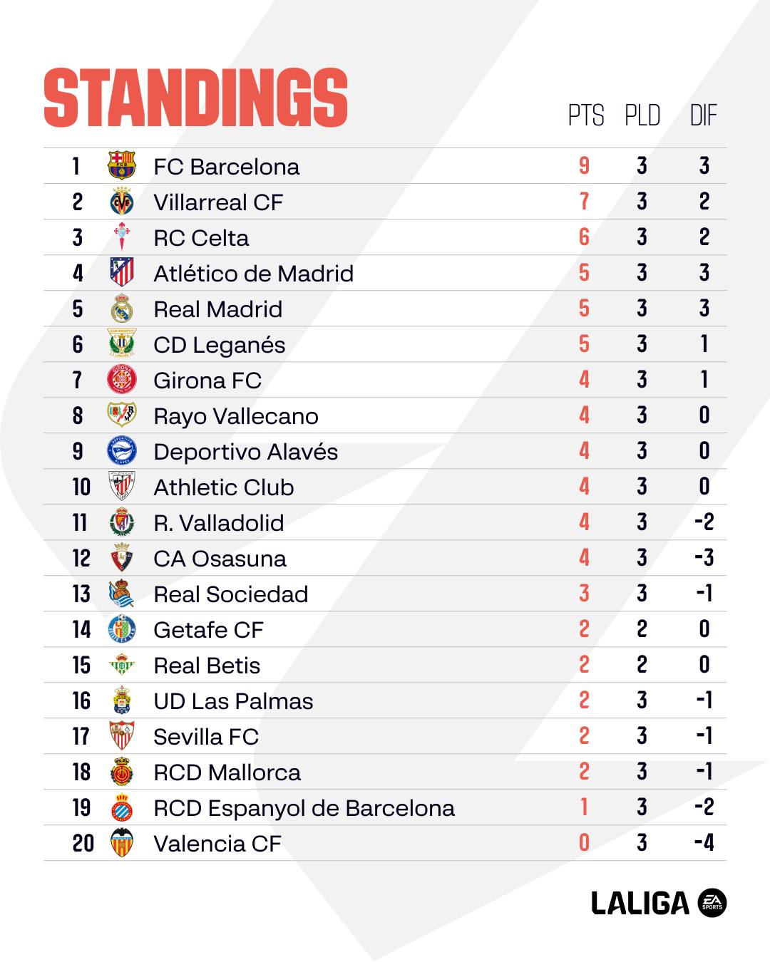 อันดับ ตารางคะแนน ลาลีกา สเปน 2024/25 หลังจบแมตซ์เดย์ที่ 3 โดย 5 อันดับเป็นไปตามลำดับมีดังนี้ (อัปเดตวันที่ 30 สิงหาคม 2567)