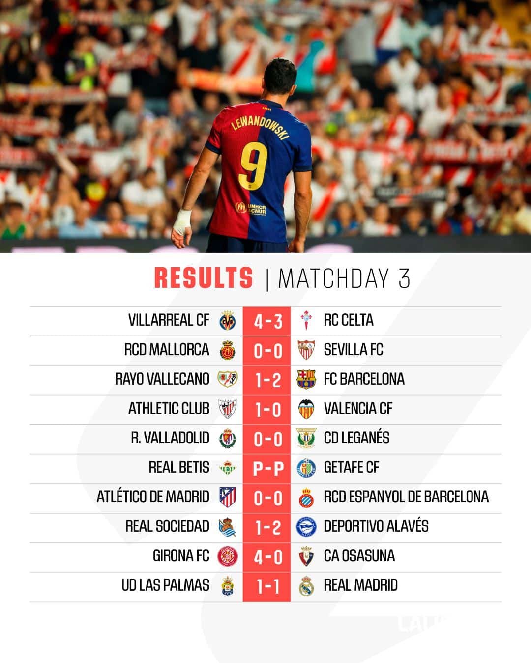 สรุปผล การแข่งขัน ลาลีกา สเปน 2024/25 หลังจบนัดที่ 3