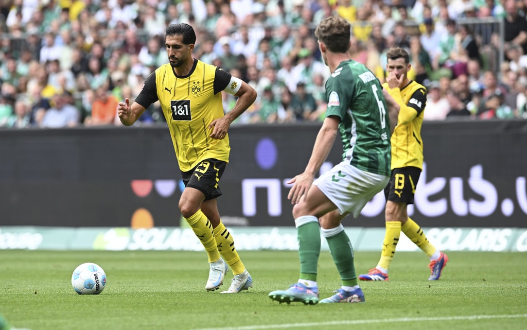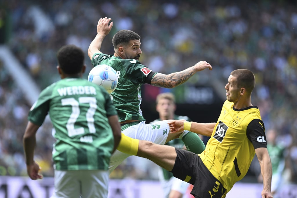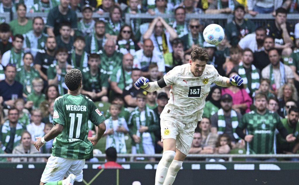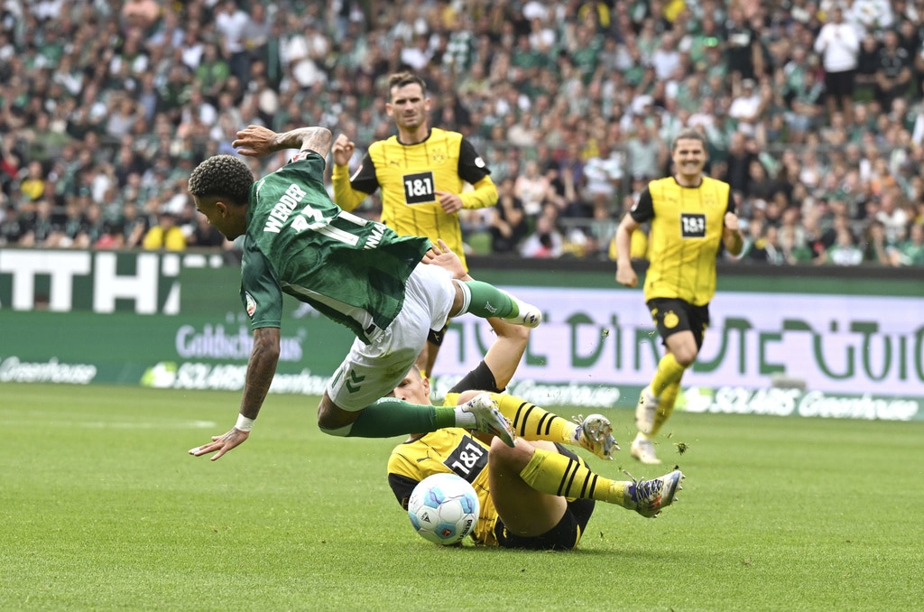 Dortmund’s Nico Schlotterbeck, bottom right, fouls Werder’s Justin Njinmah during the German Bundesliga soccer match between Werder Bremen and Borussia Dortmund in Bremen, Germany, Saturday, Aug. 31, 2024. (Carmen Jaspersen/dpa via AP)Dortmund goalkeeper Gregor Kobel clears the ball during the German Bundesliga soccer match between Werder Bremen and Borussia Dortmund in Bremen, Germany, Saturday, Aug. 31, 2024. (Carmen Jaspersen/dpa via AP)Werder’s Felix Agu, left, and Anthony Jung, centre, fight for the ball against Dortmund’s Waldemar Anton, right, during the German Bundesliga soccer match between Werder Bremen and Borussia Dortmund in Bremen, Germany, Saturday, Aug. 31, 2024. (Carmen Jaspersen/dpa via AP)Werder’s Jens Stage, centre, fights for the ball against Dortmund’s Emre Can during the German Bundesliga soccer match between Werder Bremen and Borussia Dortmund in Bremen, Germany, Saturday, Aug. 31, 2024. (Carmen Jaspersen/dpa via AP)Werder’s Anthony Jung, centre, fights for the ball against Dortmund’s Julian Ryerson during the German Bundesliga soccer match between Werder Bremen and Borussia Dortmund in Bremen, Germany, Saturday, Aug. 31, 2024. (Carmen Jaspersen/dpa via AP)