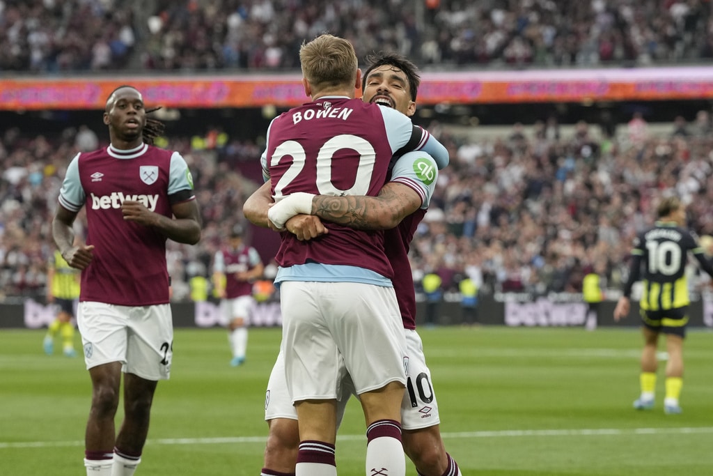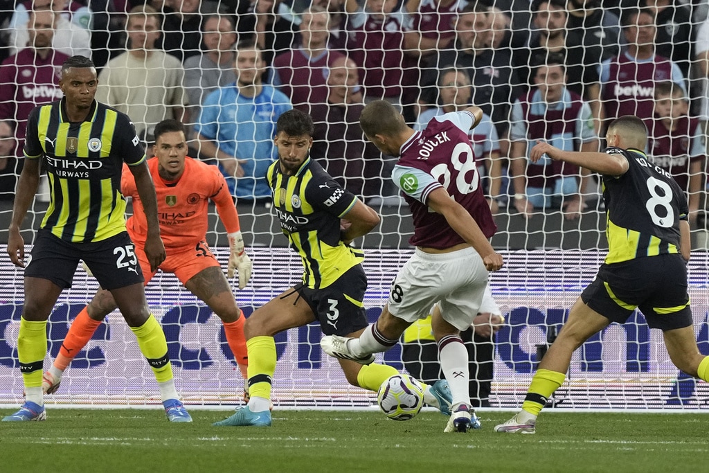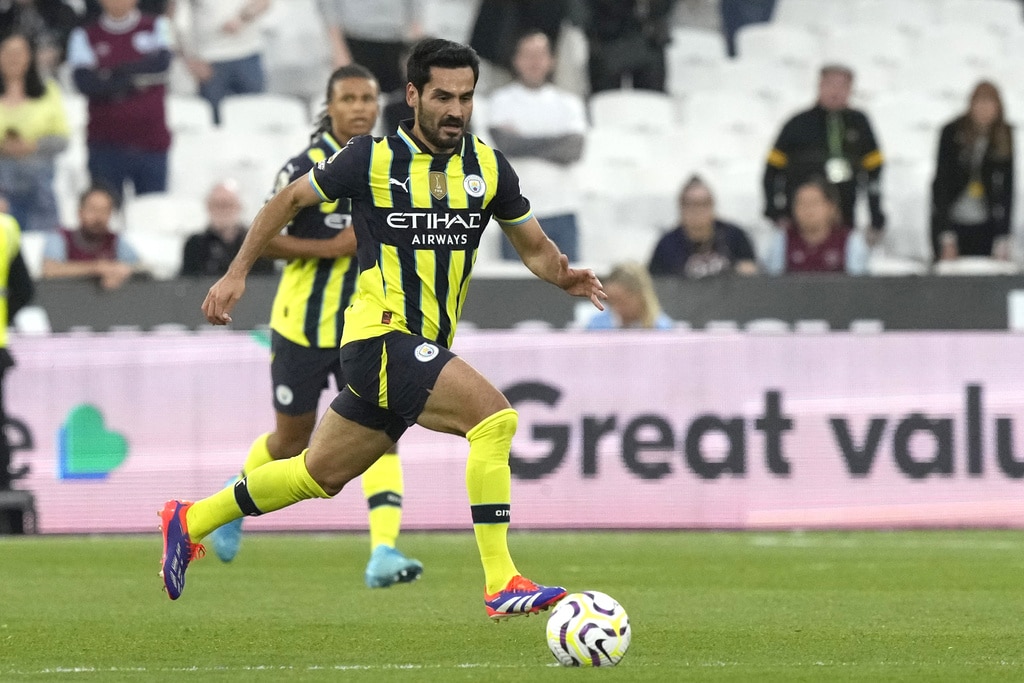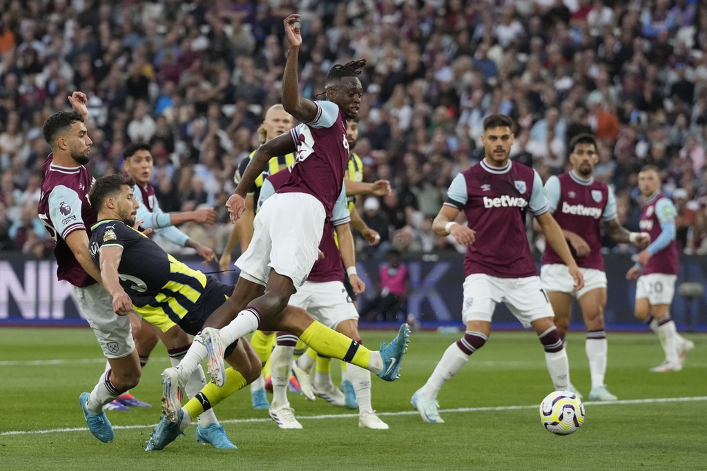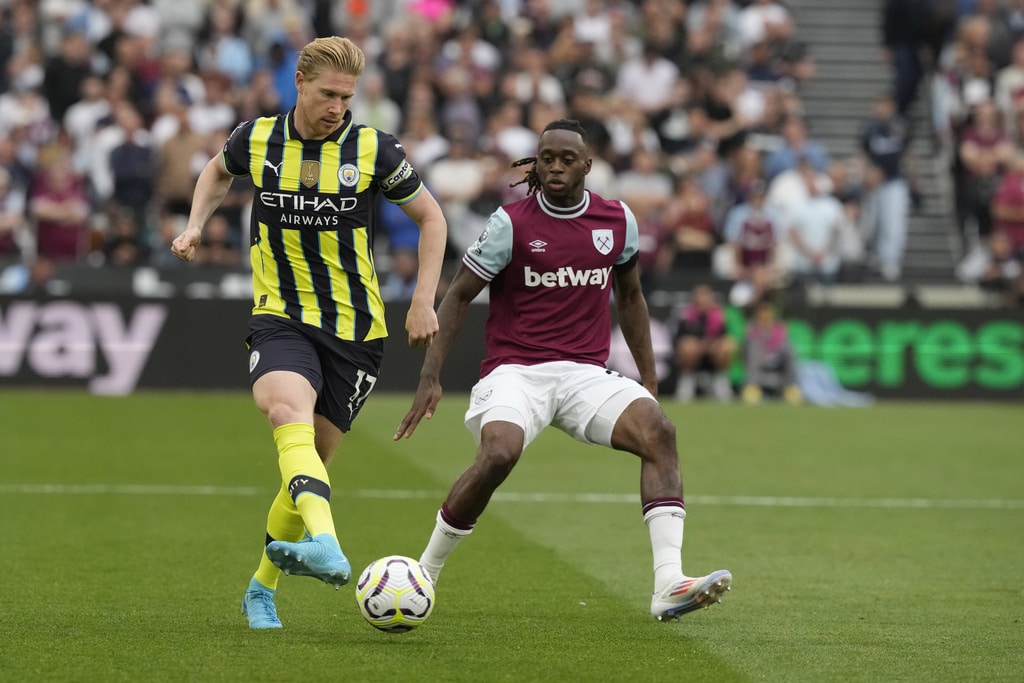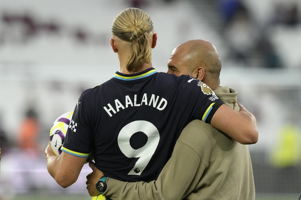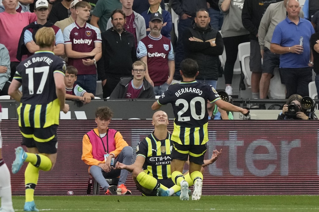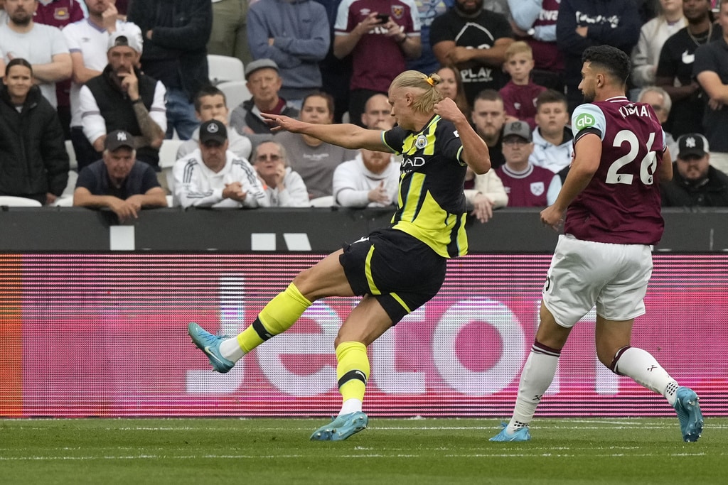 Manchester City’s Kevin De Bruyne, left, challenges for the ball with West Ham’s Aaron Wan-Bissaka during the English Premier League soccer match between West Ham United and Manchester City at the London Stadium in London, England, Saturday, Aug. 31, 2024. (AP Photo/Frank Augstein)Manchester City’s İlkay Gundogan in action during the English Premier League soccer match between West Ham United and Manchester City at the London Stadium in London, England, Saturday, Aug. 31, 2024. (AP Photo/Frank Augstein)Manchester City’s head coach Pep Guardiola hugs Manchester City’s Erling Haaland at the end of the English Premier League soccer match between West Ham United and Manchester City at the London Stadium in London, England, Saturday, Aug. 31, 2024. (AP Photo/Frank Augstein)Manchester City’s Erling Haaland, left, scores his side’s third goal during the English Premier League soccer match between West Ham United and Manchester City at the London Stadium in London, England, Saturday, Aug. 31, 2024. (AP Photo/Frank Augstein)West Ham’s Tomas Soucek, centre, makes an attempt to score during the English Premier League soccer match between West Ham United and Manchester City at the London Stadium in London, England, Saturday, Aug. 31, 2024. (AP Photo/Frank Augstein)Manchester City’s Ruben Dias, second left, makes an attempt to score during the English Premier League soccer match between West Ham United and Manchester City at the London Stadium in London, England, Saturday, Aug. 31, 2024. (AP Photo/Frank Augstein)West Ham players celebrate after Manchester City’s Ruben Dias scored own goal during the English Premier League soccer match between West Ham United and Manchester City at the London Stadium in London, England, Saturday, Aug. 31, 2024. (AP Photo/Frank Augstein)Manchester City’s Erling Haaland, centre, celebrates after scoring his side’s opening goal during the English Premier League soccer match between West Ham United and Manchester City at the London Stadium in London, England, Saturday, Aug. 31, 2024. (AP Photo/Frank Augstein)Manchester City’s Erling Haaland scores his side’s opening goal during the English Premier League soccer match between West Ham United and Manchester City at the London Stadium in London, England, Saturday, Aug. 31, 2024. (AP Photo/Frank Augstein)