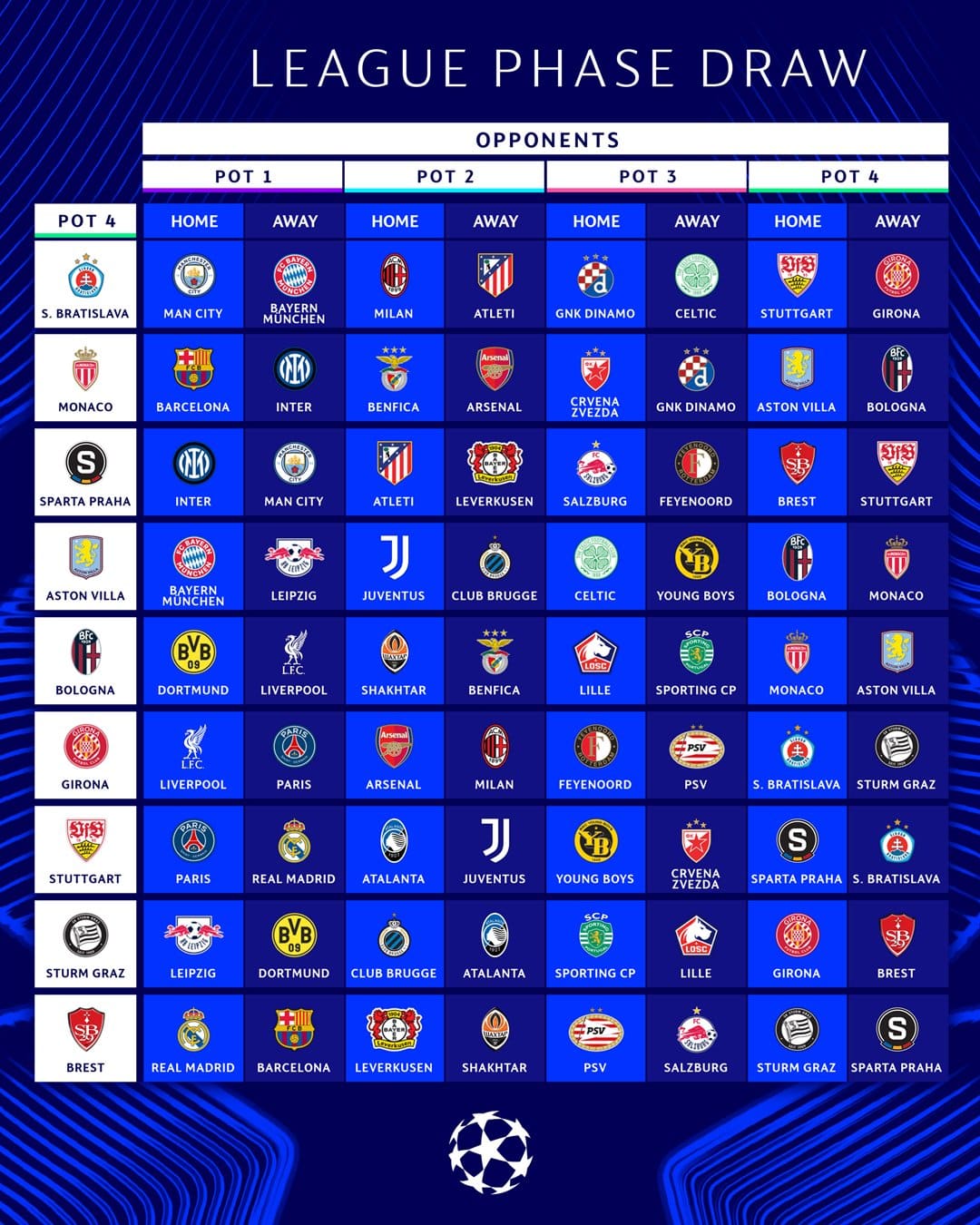 ผลจับสลาก ยูฟ่า แชมเปี้ยนส์ลีก 2024/25 รอบแรก แข่งแบบลีก มีดังนี้ (แยกตามทีม)