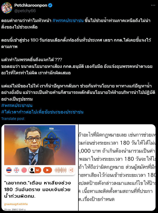 “ตอบคำถามว่าทำไมหัวหน้า #พรรคประชาชน ขึ้นไปช่วยน้ำท่วมภาคเหนือถึงไม่นำสิ่งของไปช่วยเหลือ ตอนนี้เข้าสู่ช่วง 180 วันก่อนเลือกตั้งท้องถิ่นทั่วประเทศ เลขา กกต.ได้เคยชี้แจงไว้ตามภาพ”