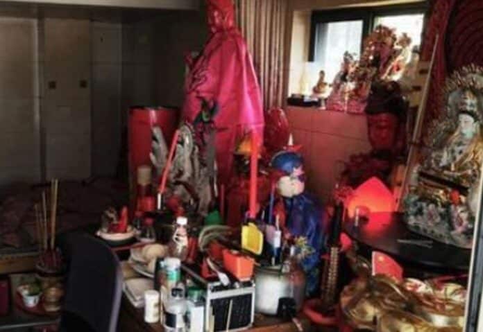 ขณะที่ตำรวจกำลังค้นบ้านพักก็เจอว่านายหวางตั้งที่เคารพบูชา และนำพระพุทธรูปที่เขาขโมยไปมาตั้งไว้ตรงนี้ พร้อมทั้งสักการะด้วยธูป ผลไม้ และยังนำพระพุทธรูปบางองค์มาทาสีใหม่เป็นสีแดงอีกด้วย ซึ่งเขาบอกว่าสาเหตุที่เขาเลือกทาเป็นสีแดงเพราะความชอบส่วนตัว
