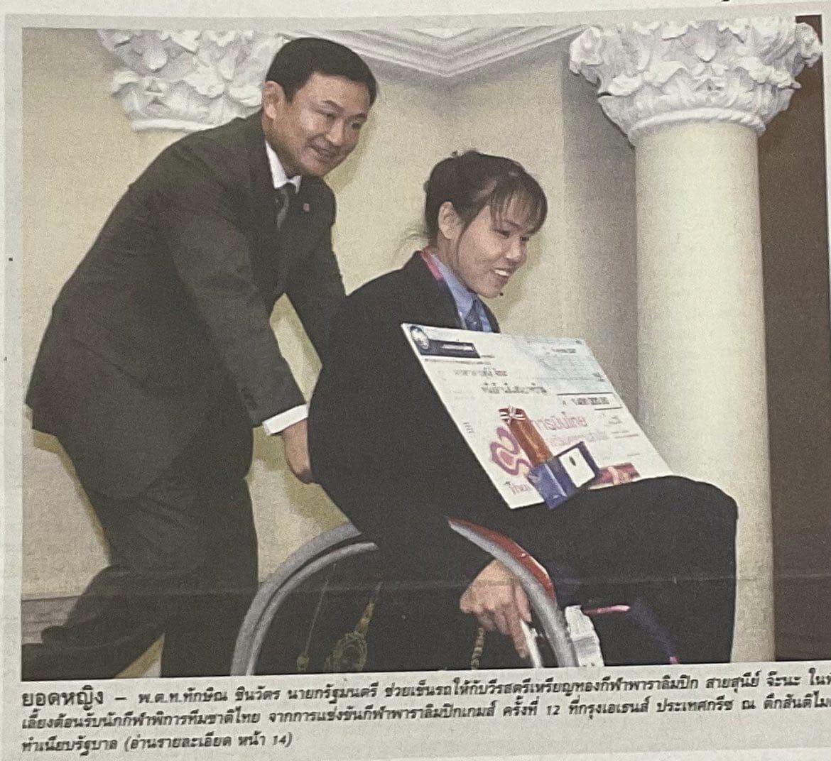 ล่าสุดเฟซบุ๊ก น.ส.แพทองธาร ชินวัตร นายกรัฐมนตรีได้แชร์ภาพสมัยที่นายทักษิณ ผู้เป็นพ่อเข็นรถเข็นให้ โดยระบุว่า “เหรียญทองที่ 4 ของพาราลิมปิกเกมส์ครั้งนี้ โดย คุณแวว-สายสุนีย์ จ๊ะนะ ในกีฬาวีลแชร์ฟันดาบ ขอแสดงความยินดีด้วยนะคะ