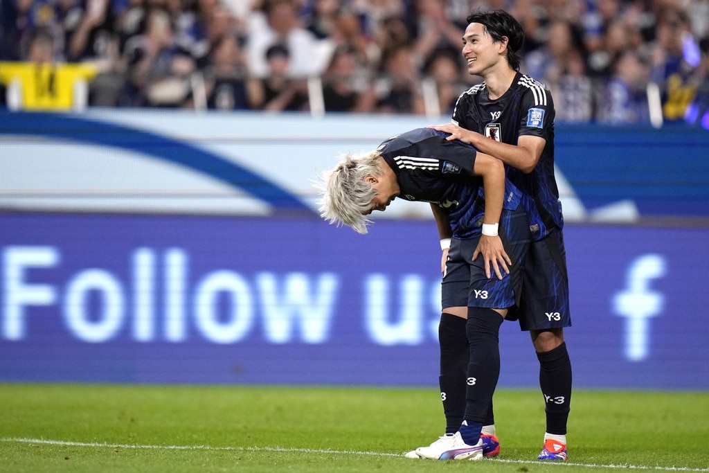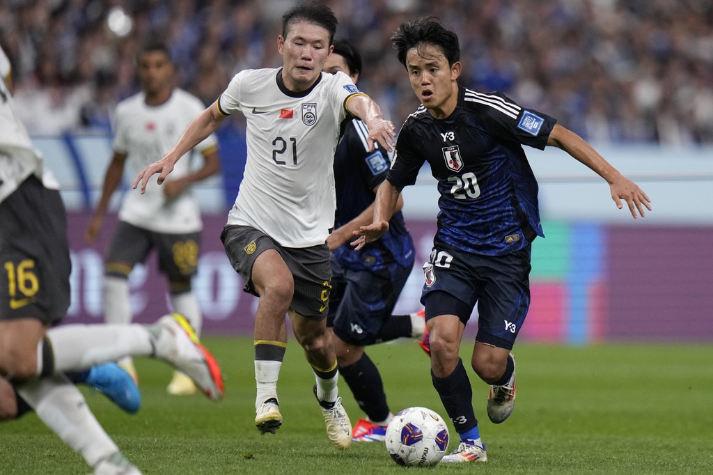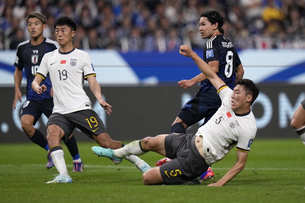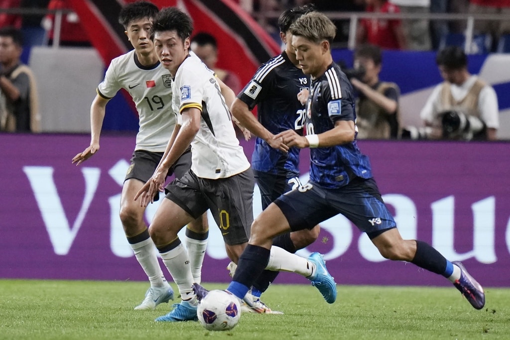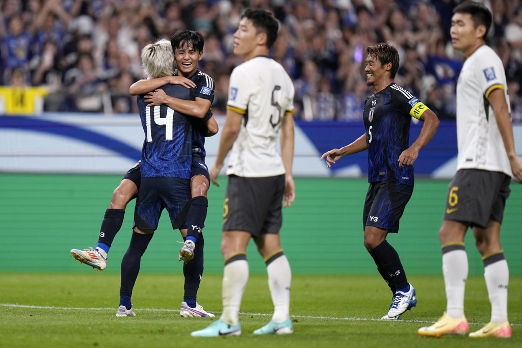 Japan’s Wataru Endo, center, celebrates his team’s first goal during a World Cup and AFC Asian Qualifier between Japan and China at Saitama Stadium 2002 in Saitama, north of Tokyo, Thursday, Sept. 5, 2024.(AP Photo/Shuji Kajiyama)Japan’s Takumi Minamino, center , scores a goal past China’s Zhu Chenjie, bottom during a World Cup and AFC Asian Qualifier at Saitama Stadium 2002 in Saitama, north of Tokyo, Thursday, Sept. 5, 2024.(AP Photo/Shuji Kajiyama)Japan’s Takefusa Kubo, right, dribbles past China’s Li Yuanyi, left, during a World Cup and AFC Asian Qualifier at Saitama Stadium 2002 in Saitama, north of Tokyo, Thursday, Sept. 5, 2024.(AP Photo/Shuji Kajiyama)Japan team celebrate after defeating China after a World Cup and AFC Asian Qualifier between Japan and China at Saitama Stadium 2002 in Saitama, north of Tokyo, Thursday, Sept. 5, 2024.(AP Photo/Shuji Kajiyama)Japan’s Junya Ito, 14, celebrates his goal during a World Cup and AFC Asian Qualifier between Japan and China at Saitama Stadium 2002 in Saitama, north of Tokyo, Thursday, Sept. 5, 2024.(AP Photo/Shuji Kajiyama)Japan’s Junya Ito, 14, celebrates his goal during a World Cup and AFC Asian Qualifier between Japan and China at Saitama Stadium 2002 in Saitama, north of Tokyo, Thursday, Sept. 5, 2024.(AP Photo/Shuji Kajiyama)Japan’s Junya Ito celebrates his goal during a World Cup and AFC Asian Qualifier between Japan and China at Saitama Stadium 2002 in Saitama, north of Tokyo, Thursday, Sept. 5, 2024.(AP Photo/Shuji Kajiyama)Japan’s Ritsu Doan and China’s Xu Haoyan10compete for the ball during a World Cup and AFC Asian Qualifier between Japan and China at Saitama Stadium 2002 in Saitama, north of Tokyo, Thursday, Sept. 5, 2024.(AP Photo/Shuji Kajiyama)Japan’s Takumi Minamino, left, and China’s Li Yuanyi, right, fight for the ball during a World Cup and AFC Asian Qualifier between Japan and China at Saitama Stadium 2002 in Saitama, north of Tokyo, Thursday, Sept. 5, 2024.(AP Photo/Shuji Kajiyama)