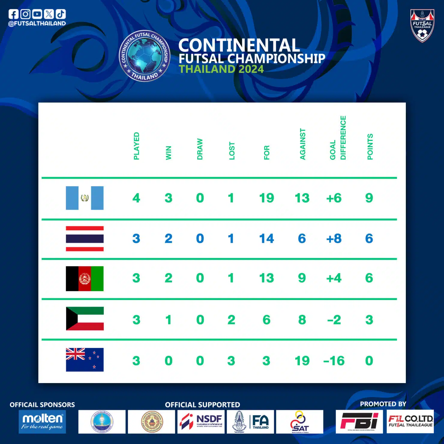 - ตารางคะแนน ฟุตซอลทีมชาติไทย ศึก Continental Futsal Championship 2024