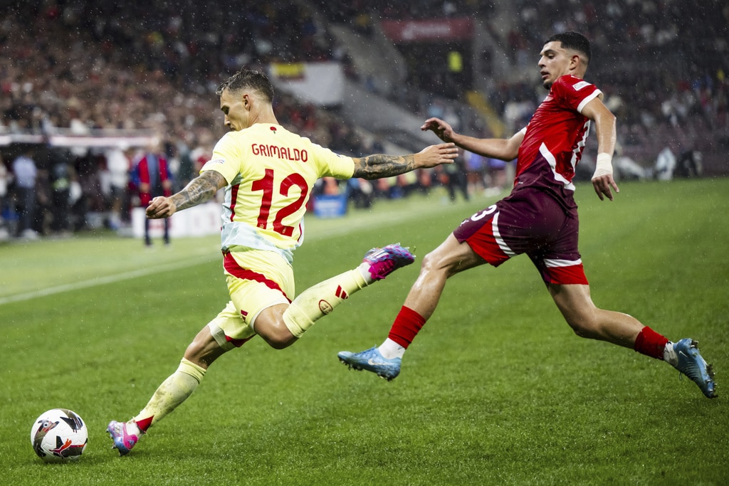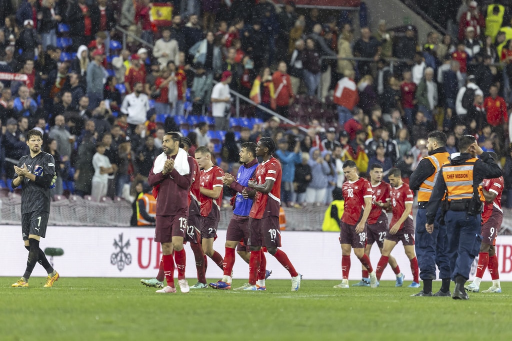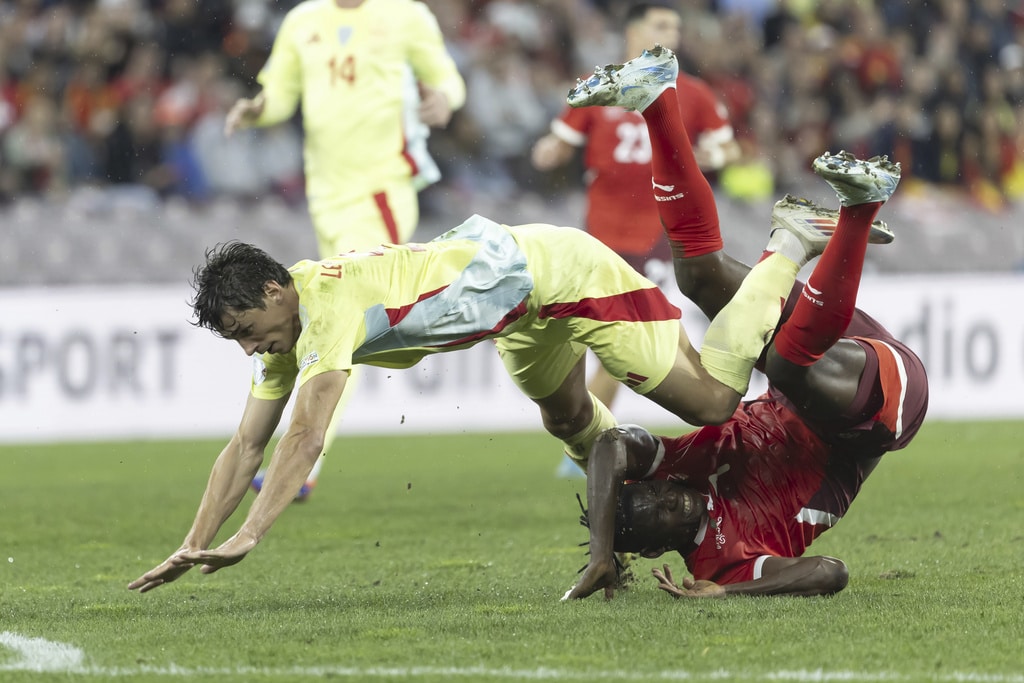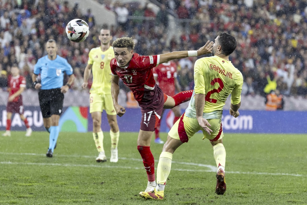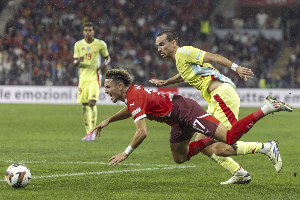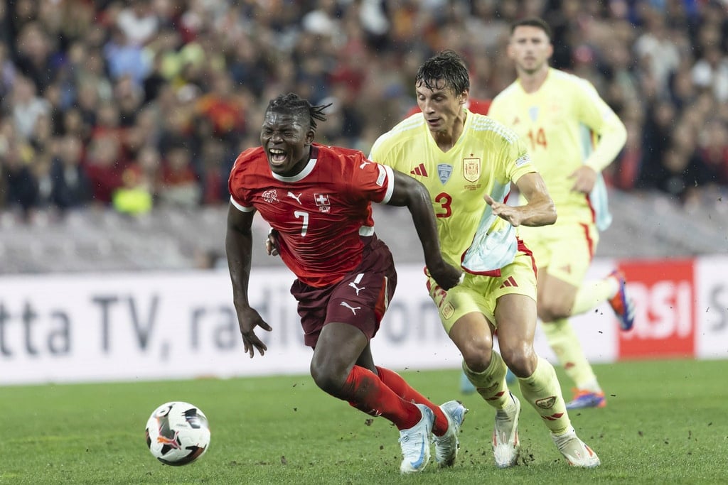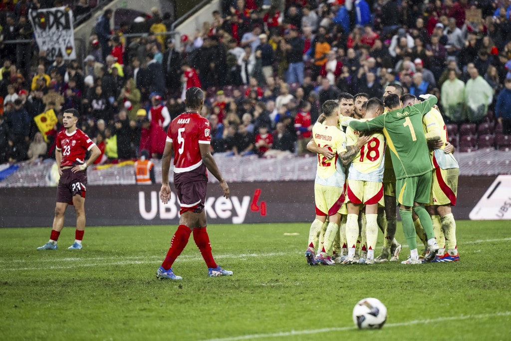 Spain’s soccer players pose during the Nations League group A4 qualifying soccer match between Switzerland and Spain, at the Stade de Geneve, in Geneva, Sunday, Sept. 8, 2024. (Jean-Christophe Bott/Keystone via AP)The referee Irfan Peljto shows the red card to Spain’s defender Robin Le Normand during the Nations League group A4 qualifying soccer match between Switzerland and Spain, at the Stade de Geneve, in Geneva, Switzerland, Sunday, Sept. 8, 2024. (Salvatore Di Nolfi/Keystone via AP)Spain’s defender Robin Le Normand, left, and Switzerland’s forward Breel Embolo, right, fall, during the Nations League group A4 qualifying soccer match between Switzerland and Spain, at the Stade de Geneve, in Geneva, Switzerland, Sunday, Sept. 8, 2024. (Salvatore Di Nolfi/Keystone via AP)Switzerland’s forward Breel Embolo, left, fight for the ball with Spain’s defender Robin Le Normand, right, during the Nations League group A4 qualifying soccer match between Switzerland and Spain, at the Stade de Geneve, in Geneva, Switzerland, Sunday, Sept. 8, 2024. (Salvatore Di Nolfi/Keystone via AP)Switzerland’s midfielder Ruben Vargas, left, fights for the ball with Spain’s defender Dani Carvajal, right, during the Nations League group A4 qualifying soccer match between Switzerland and Spain, at the Stade de Geneve, in Geneva, Switzerland, Sunday, Sept. 8, 2024. (Salvatore Di Nolfi/Keystone via AP)Switzerland’s midfielder Ruben Vargas, left, fights for the ball with Spain’s midfielder Fabian Ruiz, right, during the Nations League group A4 qualifying soccer match between Switzerland and Spain, at the Stade de Geneve, in Geneva, Switzerland, Sunday, Sept. 8, 2024. (Salvatore Di Nolfi/Keystone via AP)pain’s defender Alejandro Grimaldo, left, fights for the ball with Switzerland’s forward Zeki Amdouni, right, during the Nations League group A4 qualifying soccer match between Switzerland and Spain, at the Stade de Geneve, in Geneva, Sunday, Sept. 8, 2024. (Jean-Christophe Bott/Keystone via AP)Spain’s soccer players celebrate the victory, right, next to Switzerland’s forward Zeki Amdouni, left, and Switzerland’s defender Manuel Akanji, center, after the Nations League group A4 qualifying soccer match between Switzerland and Spain, at the Stade de Geneve, in Geneva, Sunday, Sept. 8, 2024. (Jean-Christophe Bott/Keystone via AP)Switzerland’s players walk off the field losing against the Spain’s during the Nations League group A4 qualifying soccer match between Switzerland and Spain, at the Stade de Geneve, in Geneva, Switzerland, Sunday, Sept. 8, 2024. (Salvatore Di Nolfi/Keystone via AP)Switzerland’s forward Kwadwo Duah, left, fights for the ball with Spain’s goalkeeper David Raya, right, during the Nations League group A4 qualifying soccer match between Switzerland and Spain, at the Stade de Geneve, in Geneva, Switzerland, Sunday, Sept. 8, 2024. (Cyril Zingaro/Keystone via AP)