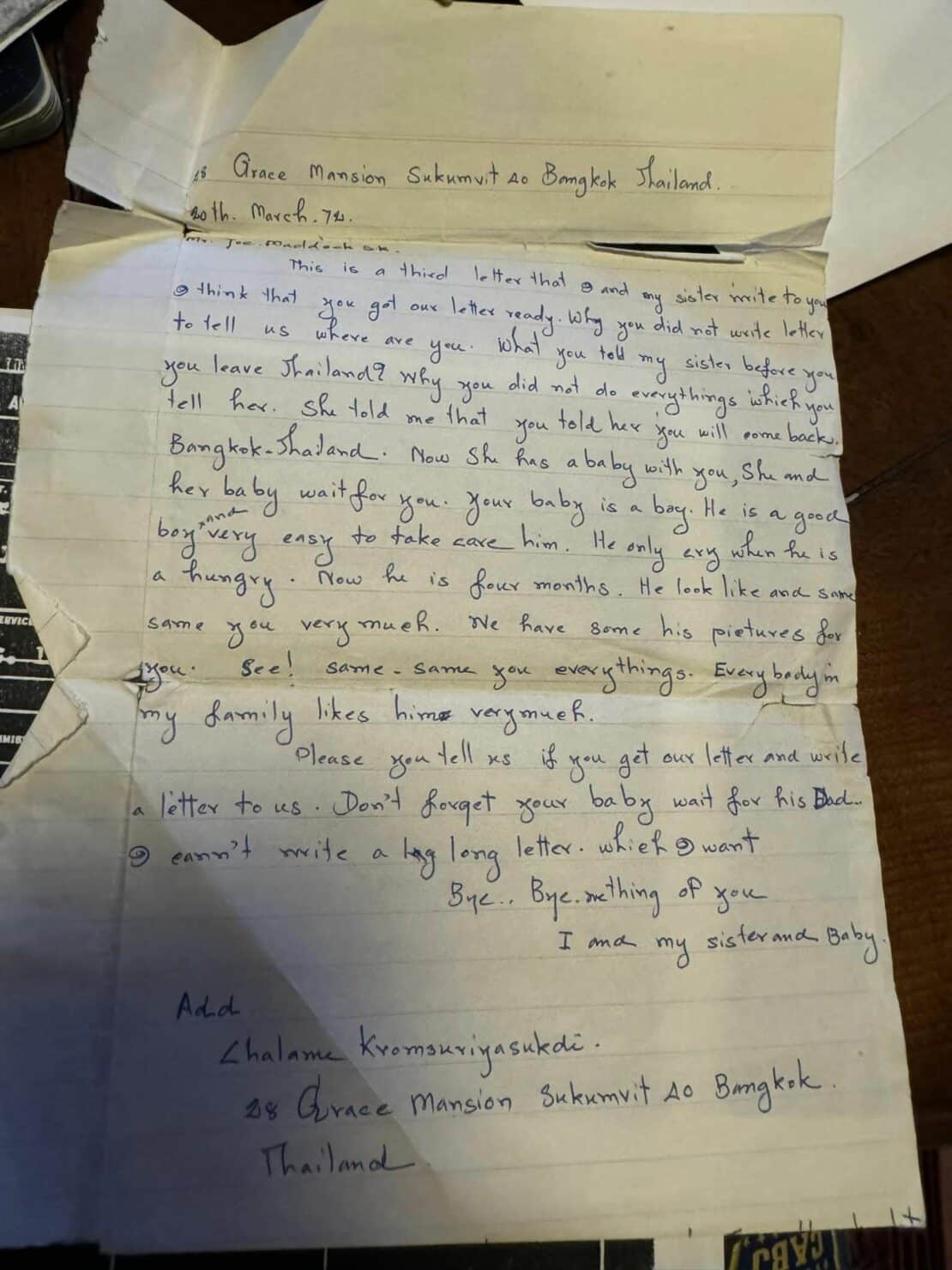 คุณนิกได้โพสต์รูปจดหมายของหญิงสาวชาวไทย ที่เขียนถึงปู่โจของเขา เมื่อปี 1974 เนื้อหามีว่า “นี่เป็นจดหมายฉบับที่สามที่ฉันและน้องสาวของฉันเขียนถึงคุณ เราคิดว่าคุณได้รับจดหมายสองฉบับแรกแล้ว ทำไมคุณไม่เขียนจดหมายมาหาเรา คุณจะบอกอะไรน้องสาวของฉันก่อนที่คุณจะจากประเทศไทยไป?